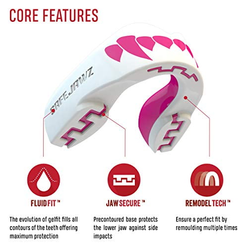 SAFEJAWZ are made of a high-grade, dual layer, Fluid-FitTM compound that allows for the ideal thickness to protect in all sports while providing a comfortable, firm fit. This snug fit is vital for protection, and that’s why SAFEJAWZ Mouthguards are re-mouldable to allow for dental changes and incorrect fittings. With a boil and bite system and fitting instructions included. Product Features: Jaw Impact Pads Ultra Slim Profile Retentive Close to Custom-fit Remodel Technology Hygienic Case Included Contoured Base For Occlusion Available in Junior (up to 11 yrs) Senior (12 yrs + )