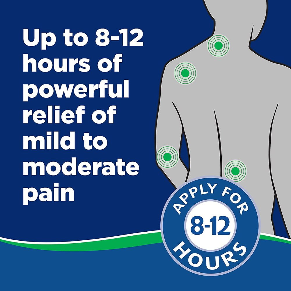 - Tackle Large or Small Pain Areas: Convenient large patches can be used for up to 12 hours of powerful pain relief targeted to large areas; Plus, check out our whole assortment of pain relief products and find a pain relief solution tailored for you
