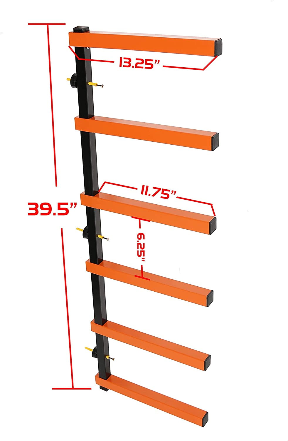 The 6-Shelf Wood Storage Rack is a Multi-functional,space-saving storage rack. It’s ideal for woodworking shops, garages, sheds, or any place that might need a sturdy shelf to store long items neatly.It’s that perfect size for both ease-of-use convenience and ample capacity. The recommended mounting distance between the rails is 4-6 feet, but can also depend on your specific needs.Place long objects like lumber, pipes, gutters, or skis between pipe shelves. The bars are also strong enough to hang additional items, keeping your space organized and clutter-free.If your material is shorter, you can certainly mount them close togetherIt can be mounted to almost anything (even a fence) to bring six levels of storage anywhere you need it.