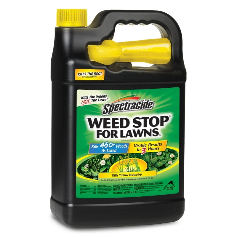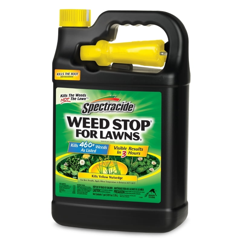 Spectracide Weed Stop For Lawns, 1 Gallon Ounces kills all types of listed broadleaf weeds including dandelion, chickweed, clover and yellow nutsedge. This product treats bluegrass, fescue, zoysia, Bermuda and perennial ryegrass. For best results, apply between 45 degrees and 90 degrees. Application above 45 degrees, the better the weeds will be able to absorb the product. Spectracide Weed Stop For Lawns kills by contact and kills weed roots. Spectracide controls 460+ weeds as listed, giving you visible results in 3 hours. When used as directed, this product kills the weeds, not the lawn.Do not apply to zoysiagrass just emerging from dormancy.