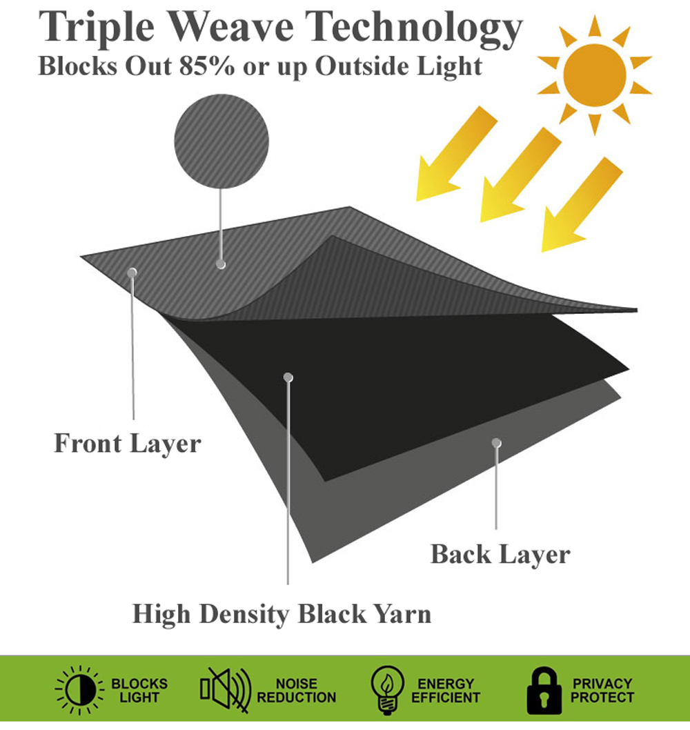 - Blackout: Heavy-duty fabric is made of triple weave technology. Block out 80%-90% of sunlight and UV rays as well as privacy protection and noise reduction. Allows you to enjoy uninterrupted sleep or enhanced TV viewing during the day or night.