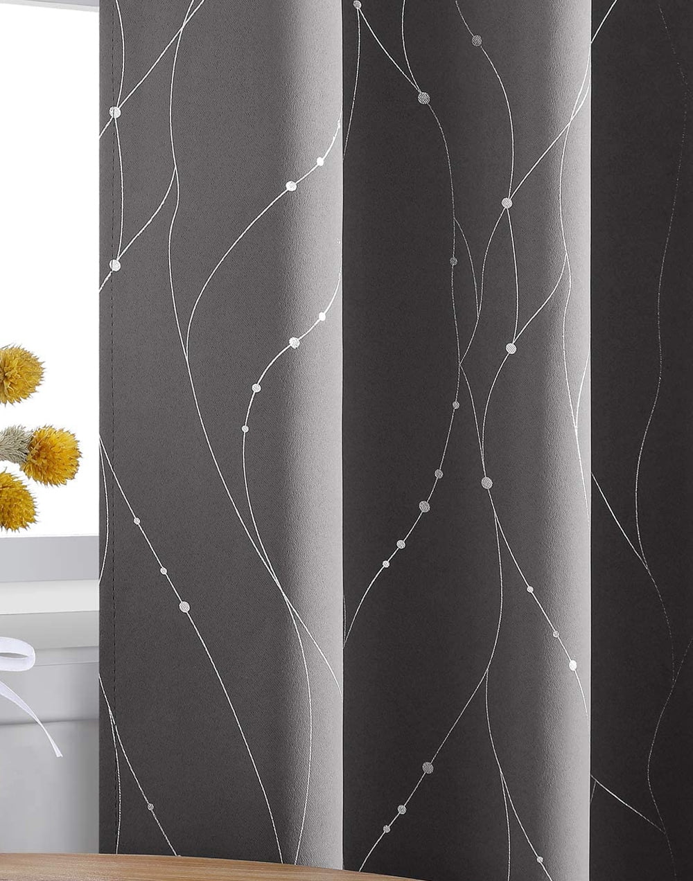 Tektrum Thermal Insulated Blackout Room Darkening Curtains with Grommet Top, Silver Foil Print Wave Lines with Dots Drapes for Living Room Bedroom Light Blocking, 52W x 63L inches, 2 Panels, Grey