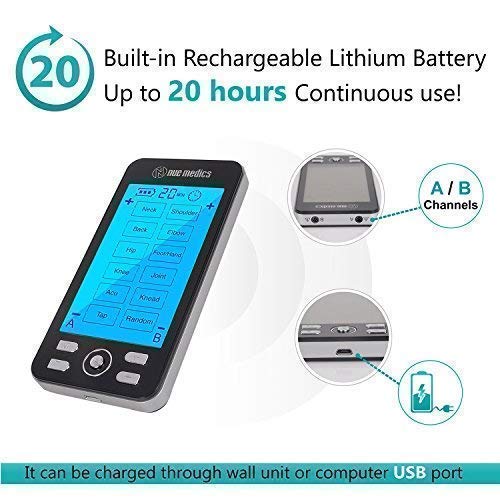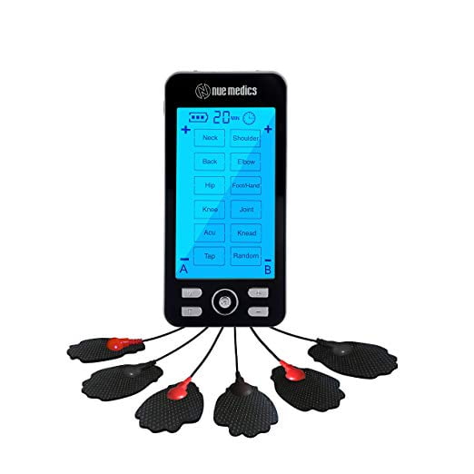 NueMedics Tens 24 is a dual-channel battery-powered multi-function device, offering both Transcutaneous Electrical Nerve Stimulator (TENS) and Powered Muscle Simulator (PMS) qualities in one device. Tens 24 offers a large Touch LCD Display, 24 Massage Modes, and 2 A-B outputs. This unit features an adjustable timer, battery life indicator, and built-in lithium battery. FEATURES: 6 preprogrammed massage modes. Neck, Acupuncture. Adjustable 20 to 60 minutes timer by using the " T " button. Rechargeable internal lithium battery. Up to 20 hours continue User-Friendly Interface – Modes are clearly labeled as "Neck", "Shoulder", "Back", "Elbow", "Hip", "Foot/Hands" The large LCD display with the new featured backlight shows you at a glance exactly what you need for your targeted area.WHAT IS INCLUDED? :