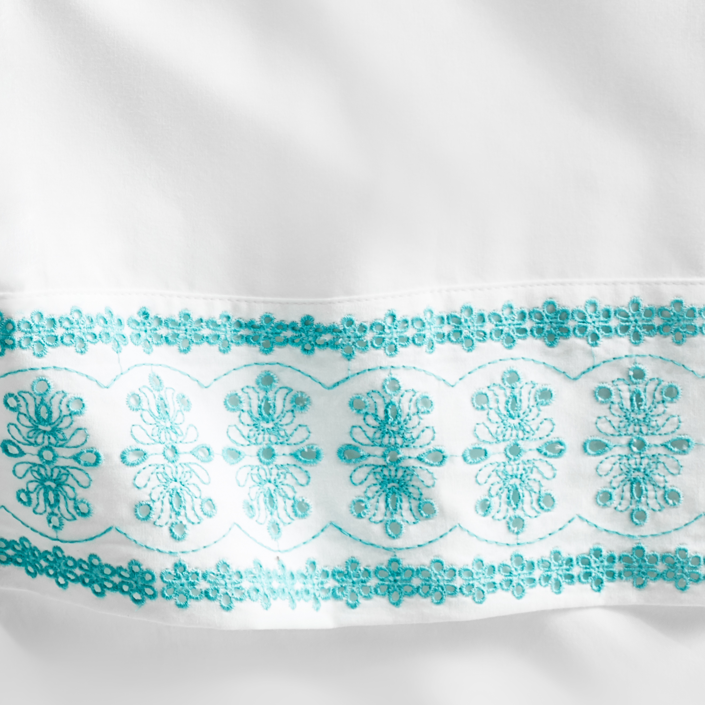 Make sure your bed is the coziest spot in the house with The Pioneer Woman 300 Thread Count Floral Eyelet Sheet Set. Featuring a gorgeous floral eyelet design in a stunning teal color, this sheet set bring country flair to any room. Each set contains a fitted sheet, flat sheet, and two pillowcases and can fit mattresses up to 16 inches deep. It’s made with breathable, lightweight durable cotton with a smooth, brushed-finished percale weave for a crisp and cool comfort. Whether you use it in your guest room or your own bedroom, this sheet set is the perfect way to make a bed. Mix and match with other pieces from The Pioneer Woman collection to complete the look of your home. Decorate your room with The Pioneer Woman 300 Thread Count Floral Eyelet Sheet Set.