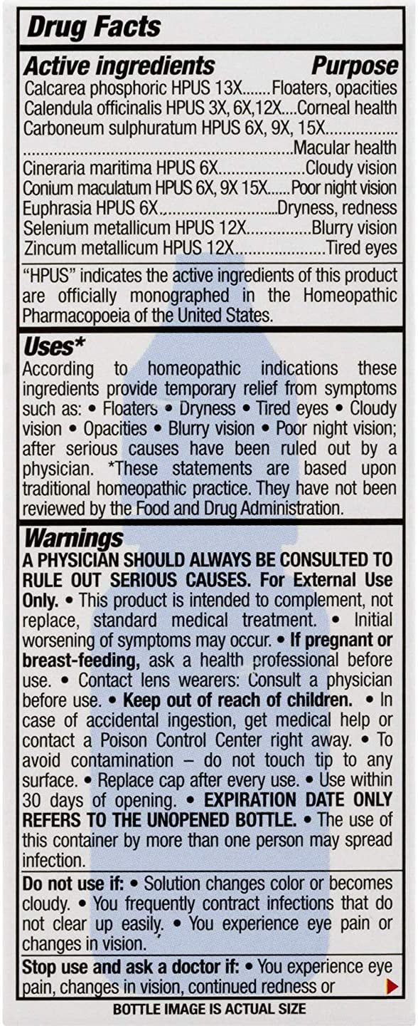 - Eye Relief – Works to provide temporary relief from the symptoms of aging eyes, including floaters, blurry vision, poor night vision and dry, red, tired eyes