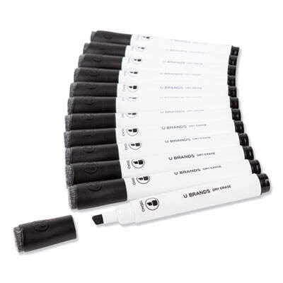 U Brands chisel tip dry erase markers feature bold and vibrant color inks that dry quickly, erase easily and work great on any dry erase board surface. The markers also feature long-lasting, non-toxic, low odor ink that is great in any classroom, home or office environment. The dry erase markers feature a chisel tip for a bold and precise writing experience on any melamine, painted steel, porcelain or glass dry erase surface. The built-in felt eraser into the marker cap enables quick, convenient and precise erasing. For best results, re-cap the marker immediately after use and store horizontally. Marker Ink Type: Dry Erase; Marker Tip Type: Chisel; Marker Tip Size (text): Broad; Marker Color(s): Black.U Brands Chisel Tip Low-Odor Dry-Erase Markers with Erasers, Black, Dozen