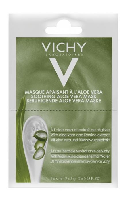 Vichy Soothing Aloe Vera Mask 2 x 6ml is a mask with extracts of aloe vera and licorice with soothing and anti-redness properties, specifically elaborated for dry skin and irritated by dry skins. Formulated with Mineralizing Thermal Water of Vichy, this mask makes the skin fresh, the redness and tightness are reduced. The skin is like regenerated. High tolerance. Tested on sensitive skin, under dermatological control. Hypoallergenic.Vichy Soothing Aloe Vera Mask 2 x 6ml