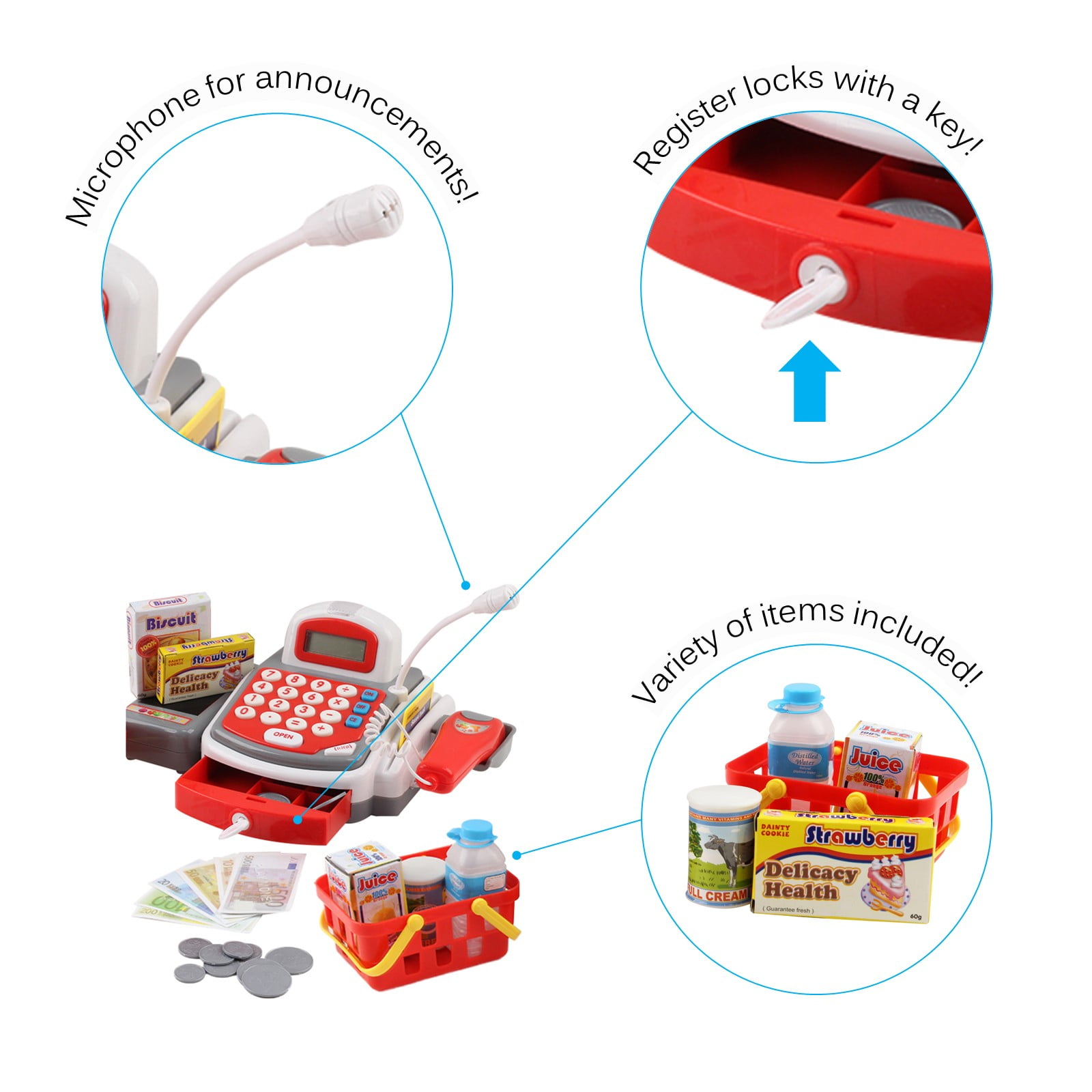 Vokodo Toy Cash Register With Microphone Calculator Grocery Items Shopping Basket Scanner And Pretend Play Money Kids Supermarket Cashier Bank Perfect Gift For Preschool Children Boys Girls Toddlers