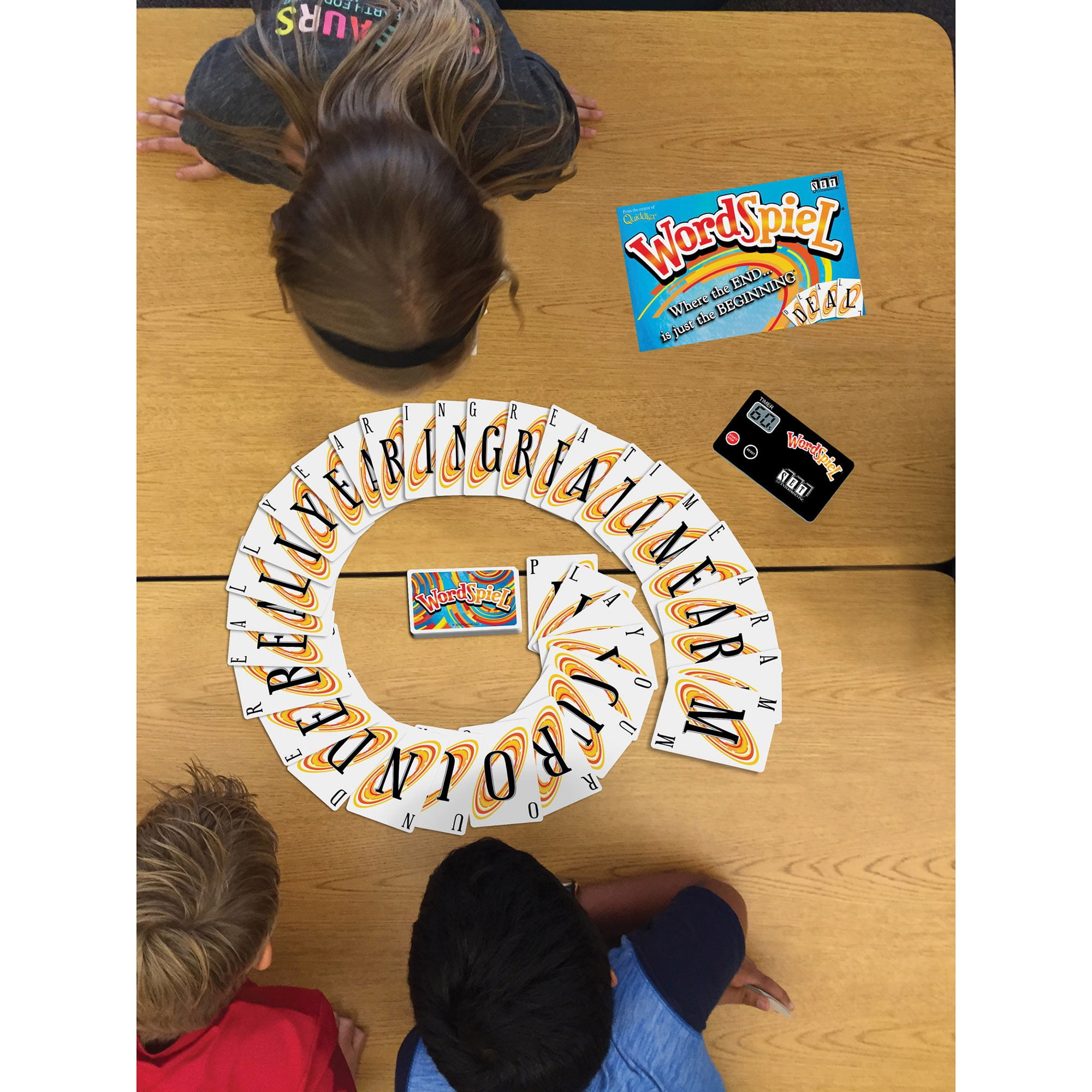 Wordspiel, by SET Family Games | Where the END…is just the BEGINNING! Use your words wisely and be the first to get rid of your cards! Each word spins off the last, so the game will never be the same twice! During your turn, simply start your word with the last card played. Just like the name, WordSpiel (“Spiel” uses the “S” from “Words”). Get it?! Use the timer or take your time, just be sure to put your best word forward! WordSpiel is a simple, yet dynamic card game that everyone enjoys! Contents: 110 Cards, Timer, Rules. For 1-6 players, ages 8 and up.