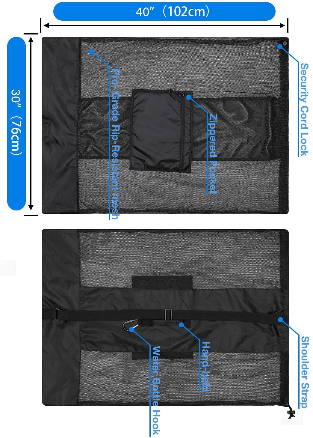 【EXTRA LARGE】 Measured at 30" x 40" mesh bags drawstring holds up to 15 + size 5 soccer balls or 10 + basketballs! Ingenious and well designed zippered pocket perfect for air pump, gloves,stopwatch, whistles and your personal item. It is the one equipment bag you will ever need for all your sports and outdoor events .