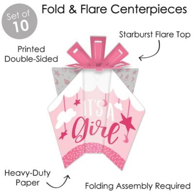 - It’s a Girl Fold and Flare Centerpieces INCLUDE: 10 heavy-duty paper centerpieces in our It’s a Girl theme. Each centerpiece has art on all four sides and starburst top for an impressive display. Some simple folding assembly required.
