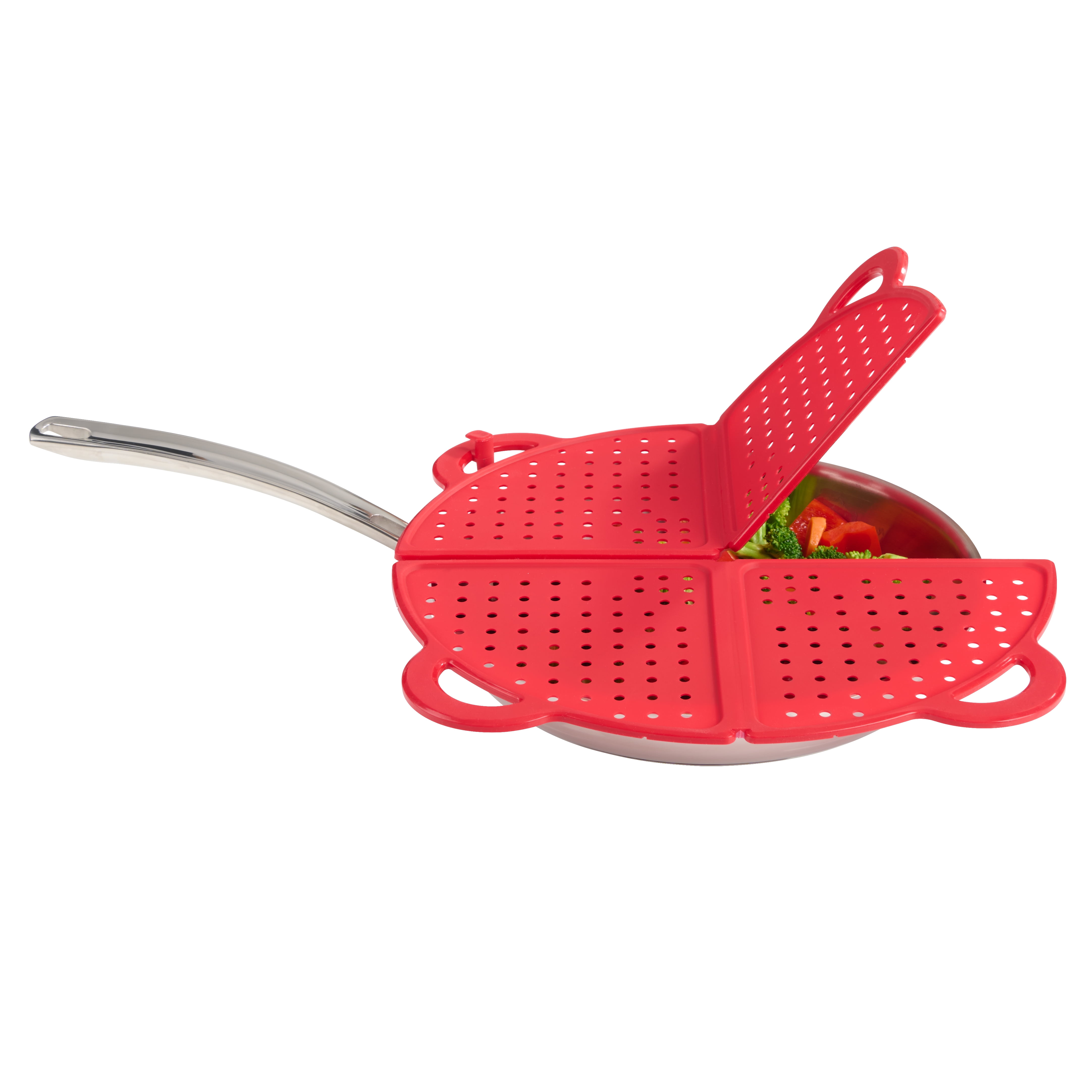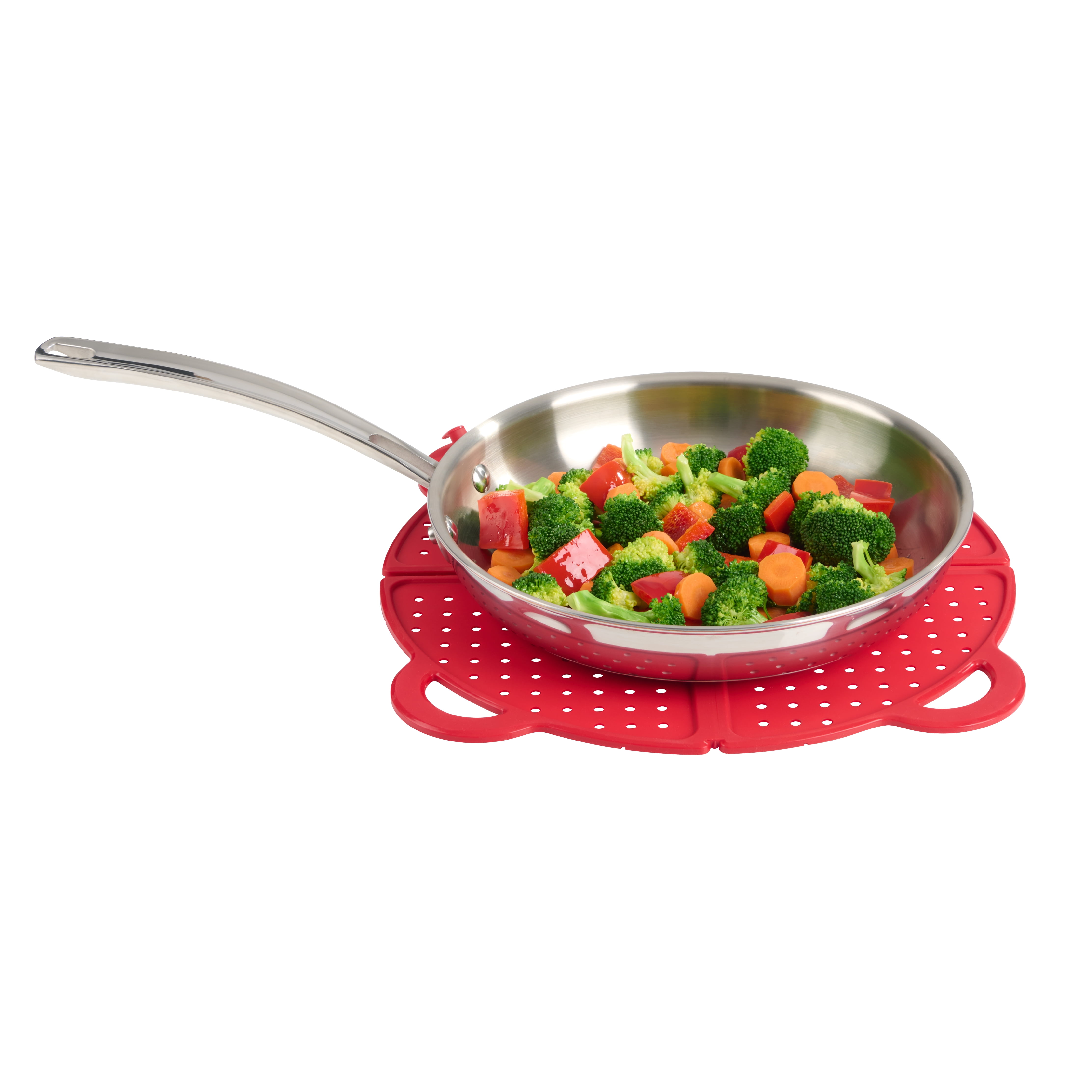 The Mainstay foldable splatter screen can be used over 12” pots and pans, and is multi purpose. It can also be used as Trivet. The sturdy construction has an interior steel rim core and easy lift handles. The splatter screen has the ability to fold in to quarters and locks allowing for easy and convenient storage. The color is red and is BPA free to ensure years of safe usage by your family. Made of durable Silicone that is non-absorbent, non-porous, and will not hold in odors. This item is dishwasher safe for easy cleaning.