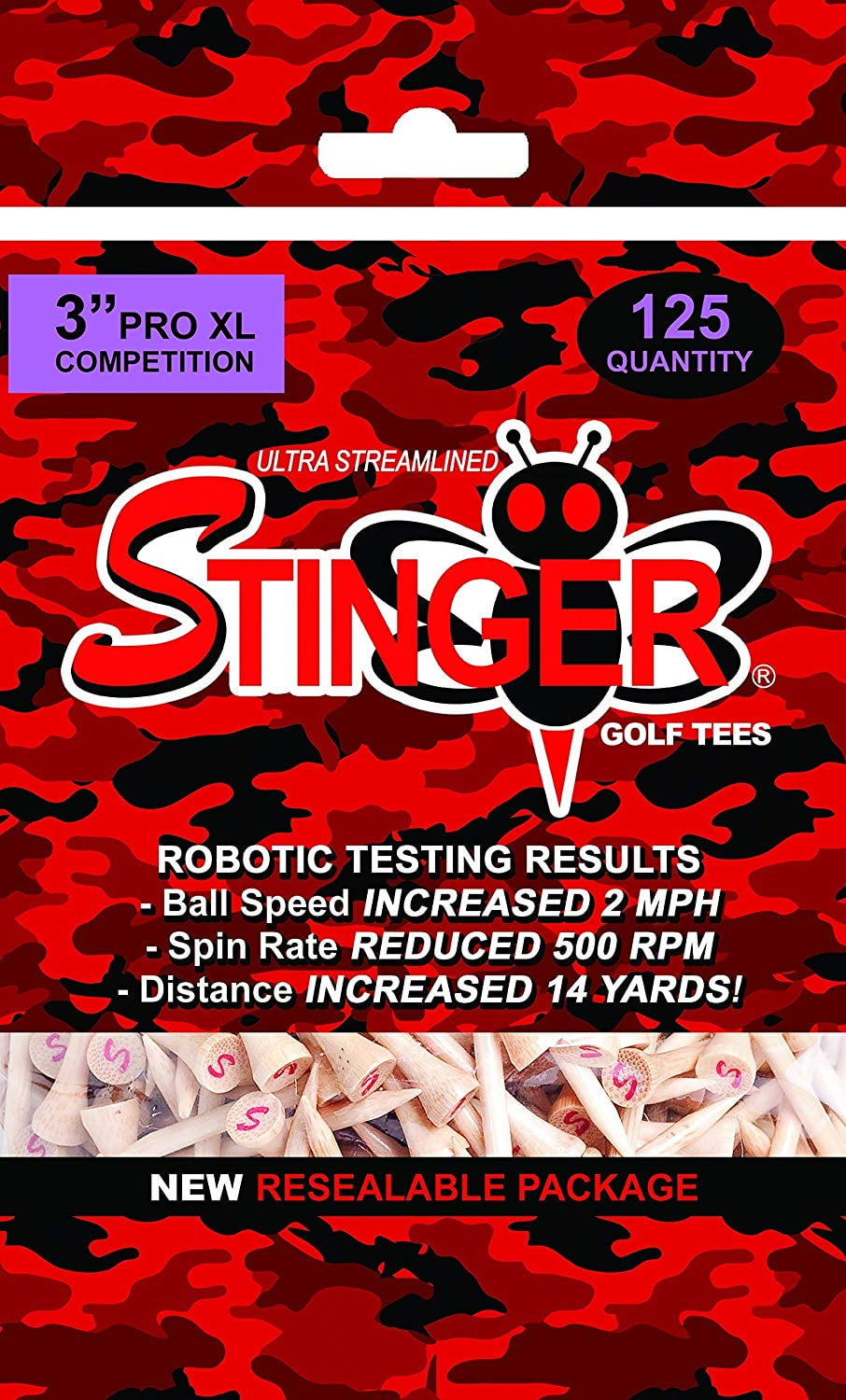 Stinger Pro XL Competition 3" Long Golf Tees Bag of 125 Tees. Smaller cup equals less resistance. Less resistance equals more distance.Increased ball speed on robotic testing by 2 MPH, spin rate reduced by 500RPM. Distance increased by 14 Yards.Retail Package of 3" Comp. Stinger Golf Tees- 125 Count