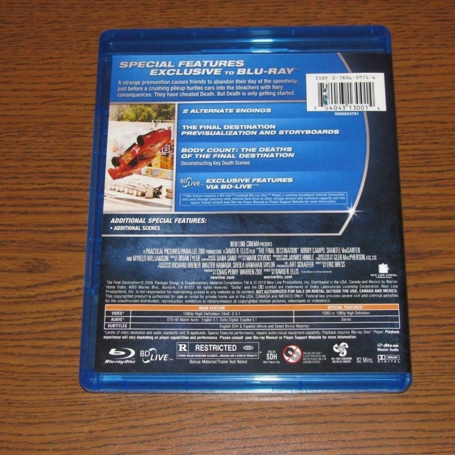 The Final Destination [Blu-ray]The movie series that taps into your deepest fears returns with a new and imaginative chapter that delivers the expected – in so many keep-you-guessing… unexpected ways! A strange premonition causes friends to abandon their day at the speedway, just before a crushing pileup hurtles cars into the bleachers with fiery consequences. They have cheated Death. But Death is only getting started. From the director of "Snakes on a Plane" comes the eerie, innovative tale of the friends’ fierce fight to keep themselves and others alive.