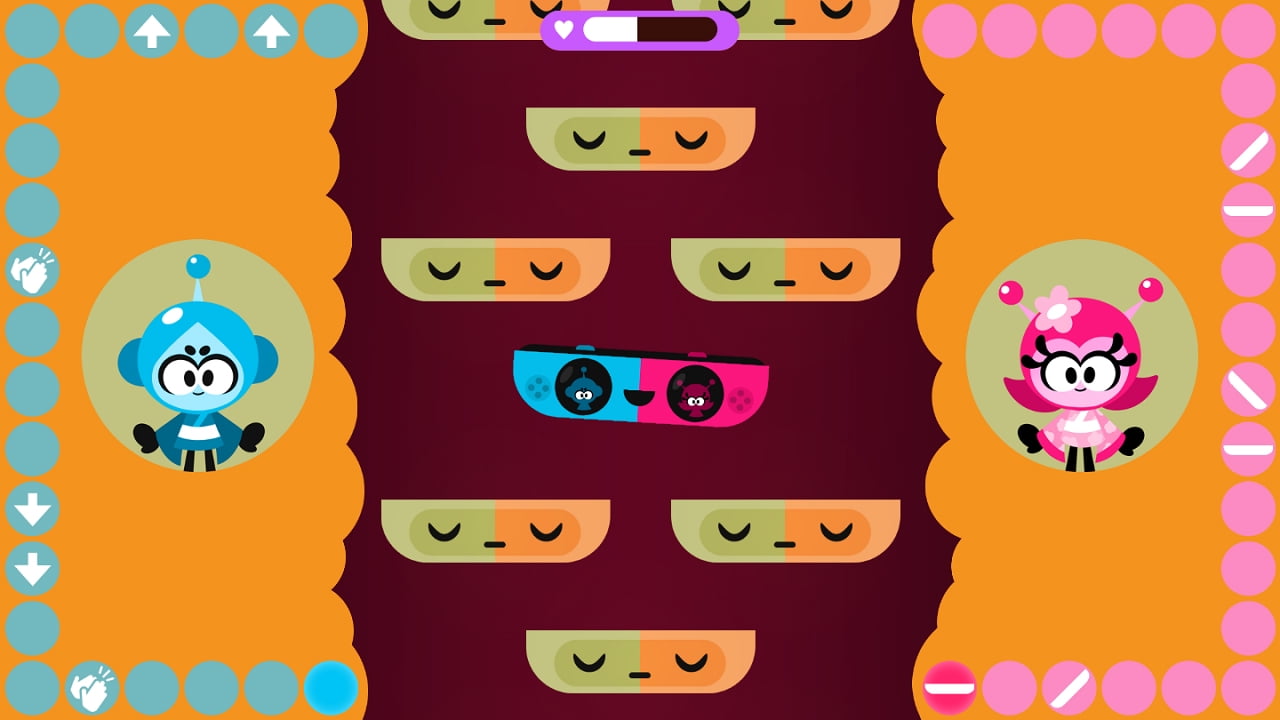 When playing together, coordination is key, as one player holds the Joy-Con™ controller vertically to move and shoot, and the other holds the Joy-Con horizontally to rotate and aim. Only by forming a connection and harnessing the vitamin power of Vita-Boy & Mina-Girl will you be able to stop the molecular menace!