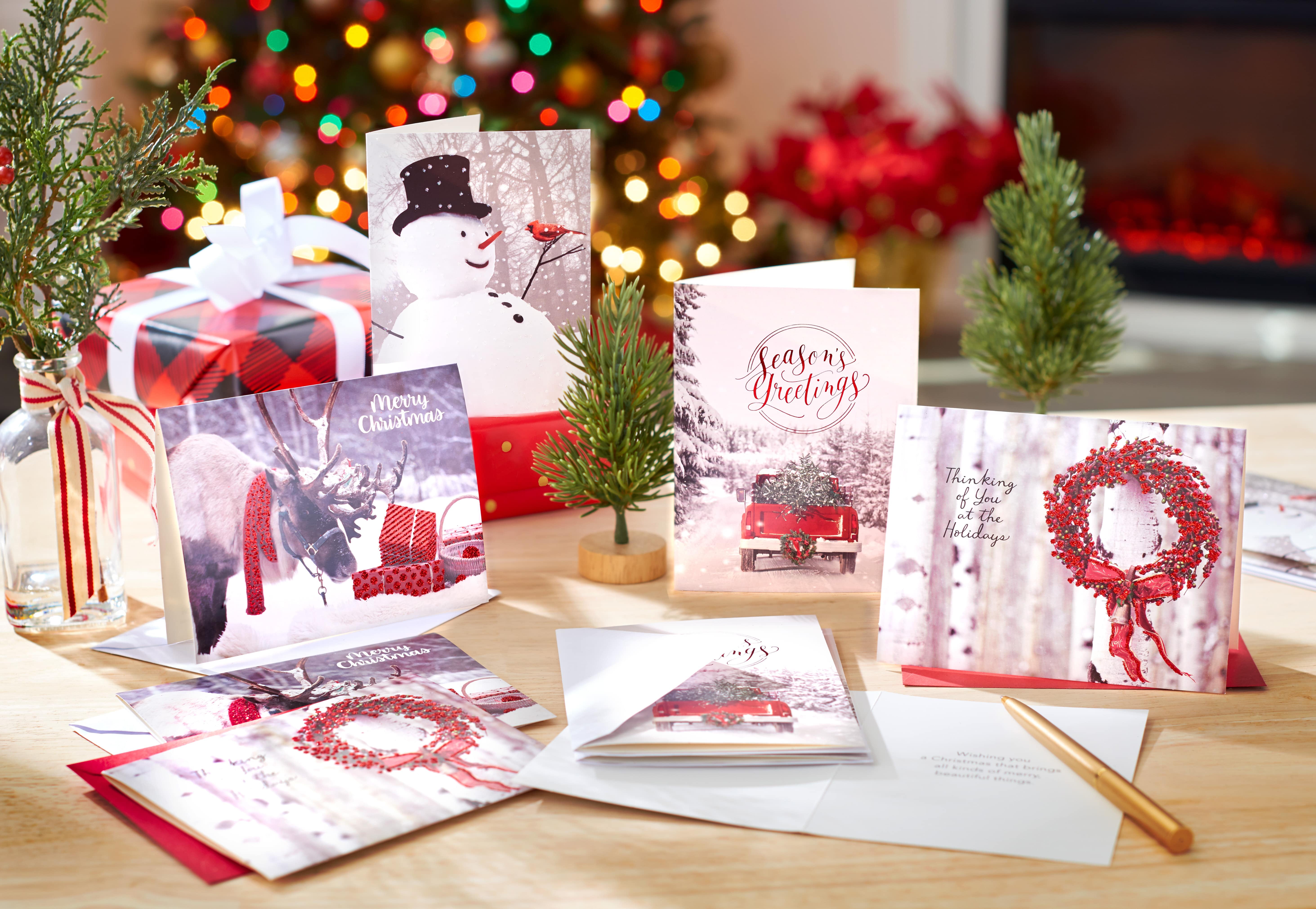 Brighten the season with beautiful winter scenes on cards featuring either a reindeer with presents, a snowman with a cardinal, a truck with a tree or a holly berry wreath hanging from a birch tree. This deluxe boxed cards set of 20 mini holiday cards (5 each of 4 designs) with white envelopes comes packaged in a unique, pinwheel-style assortment to keep cards protected and make viewing them easy. All Christmas cards feature sophisticated black-and-white photography with pops of red, embellished with sparkling glitter and shimmering foil. Send holiday stationery cards to all your loved ones and share the joy!