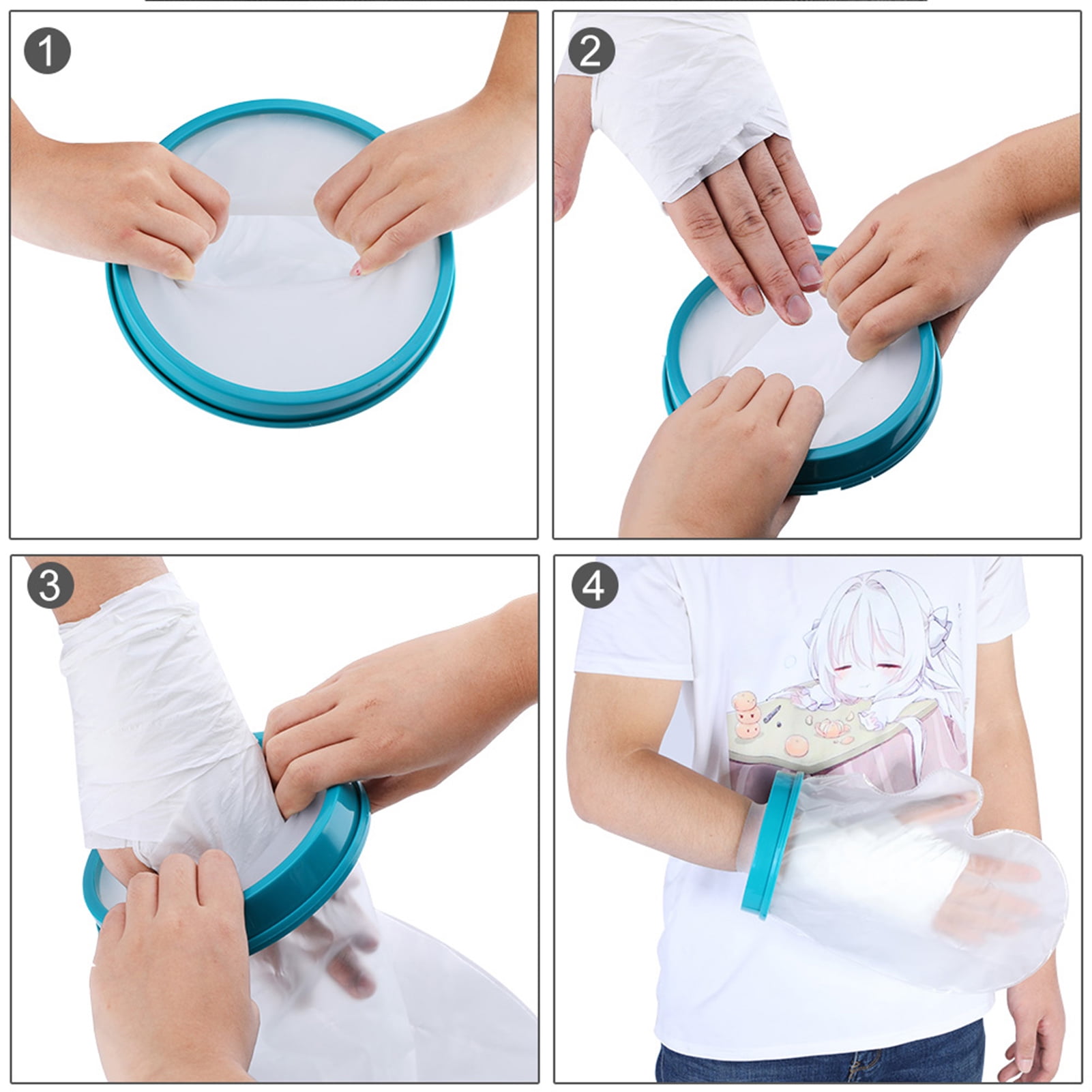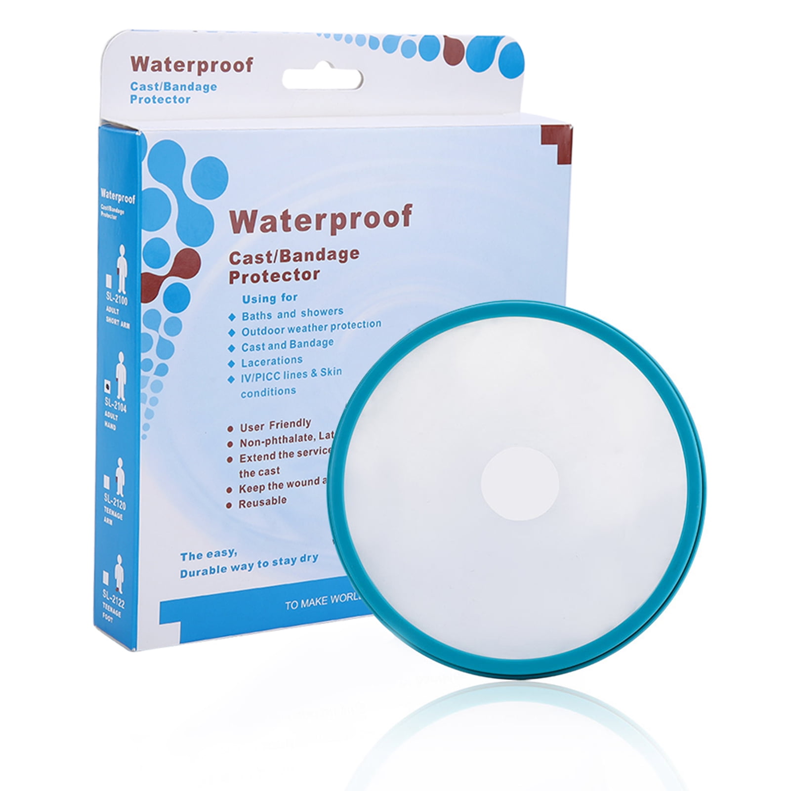 Color: blue circle+transparent protective bag; material: pp+silicone+pvc; weight: 160g; silicone sheet specification: OD163.5/ID28.5mm Product size: 310x230x150 MM waterproof protection zone is from fingertip to 310MM wrist position; Single color box packaging size: 16x16x3cm; the product is waterproof, resistant to washing, and used for multiple times; high sealing performance, medicaly thermoplastic elasticity; usage scenarios: fear that the wound will not heal with water; fear that the wound will be infected by dust; cannot be plastered Bathing; a product designed for patients who need to take a bath due to burns, skin breakage, plaster or splint installation, chemotherapy, PICC/infusion needle placement, etc., to prevent from being wetted and designed. Super cost-effective waterproof sheath; audience : Palms and fingers are injured and fractured. They should not be exposed to water, but those who need to take a bath; Effective waterproof hand cast cover for: Plaster and Synthetic Casts Bandages Splints Burns Rashes Lacerations