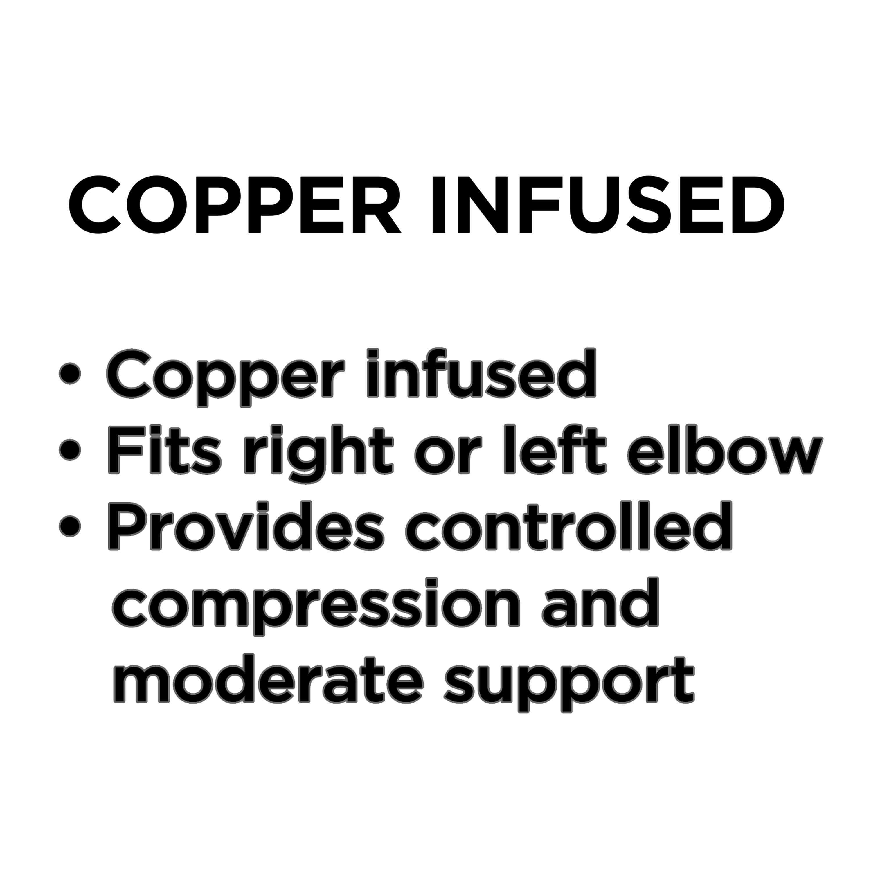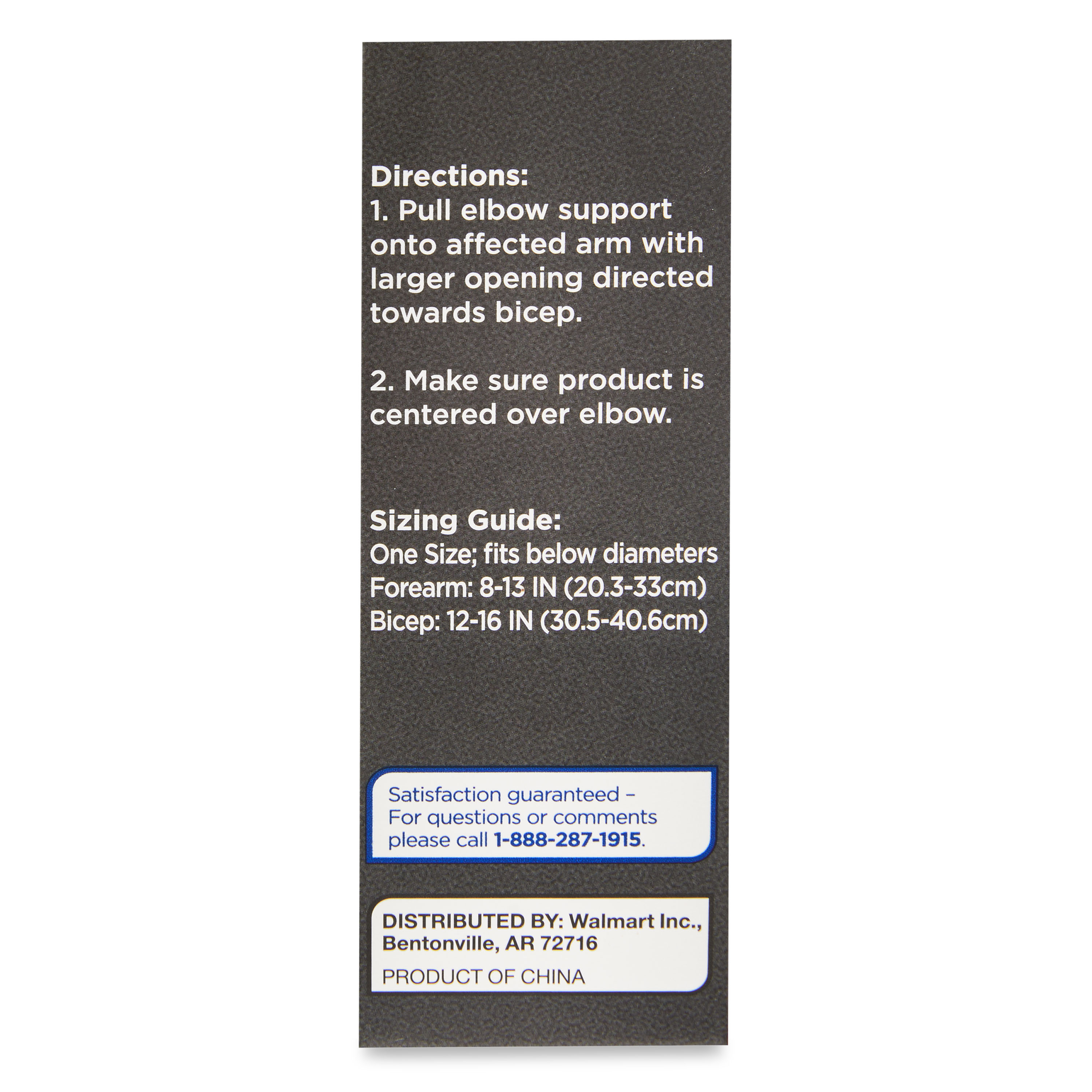 Get relief from muscle and joint stiffness and soreness with our Equate Copper Infused Elbow Support. Our versatile elbow support sleeve is designed to comfortably fit either the right or left elbow while providing controlled compression and moderate support. The sleeve’s compression supports improved circulation and oxygenation of biceps and triceps tendons to help reduce swelling for faster recovery. To use, simply pull the elbow support onto the affected arm with larger opening directed towards the bicep, making sure that the support is centered over the elbow. Help yourself to the soothing effects of our Equate Copper Infused Elbow Support’s high-performance compression support.