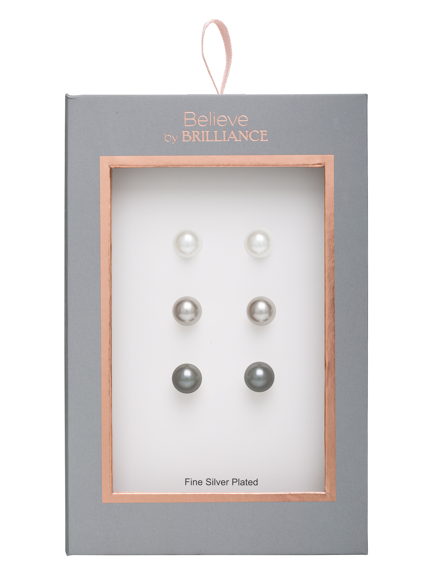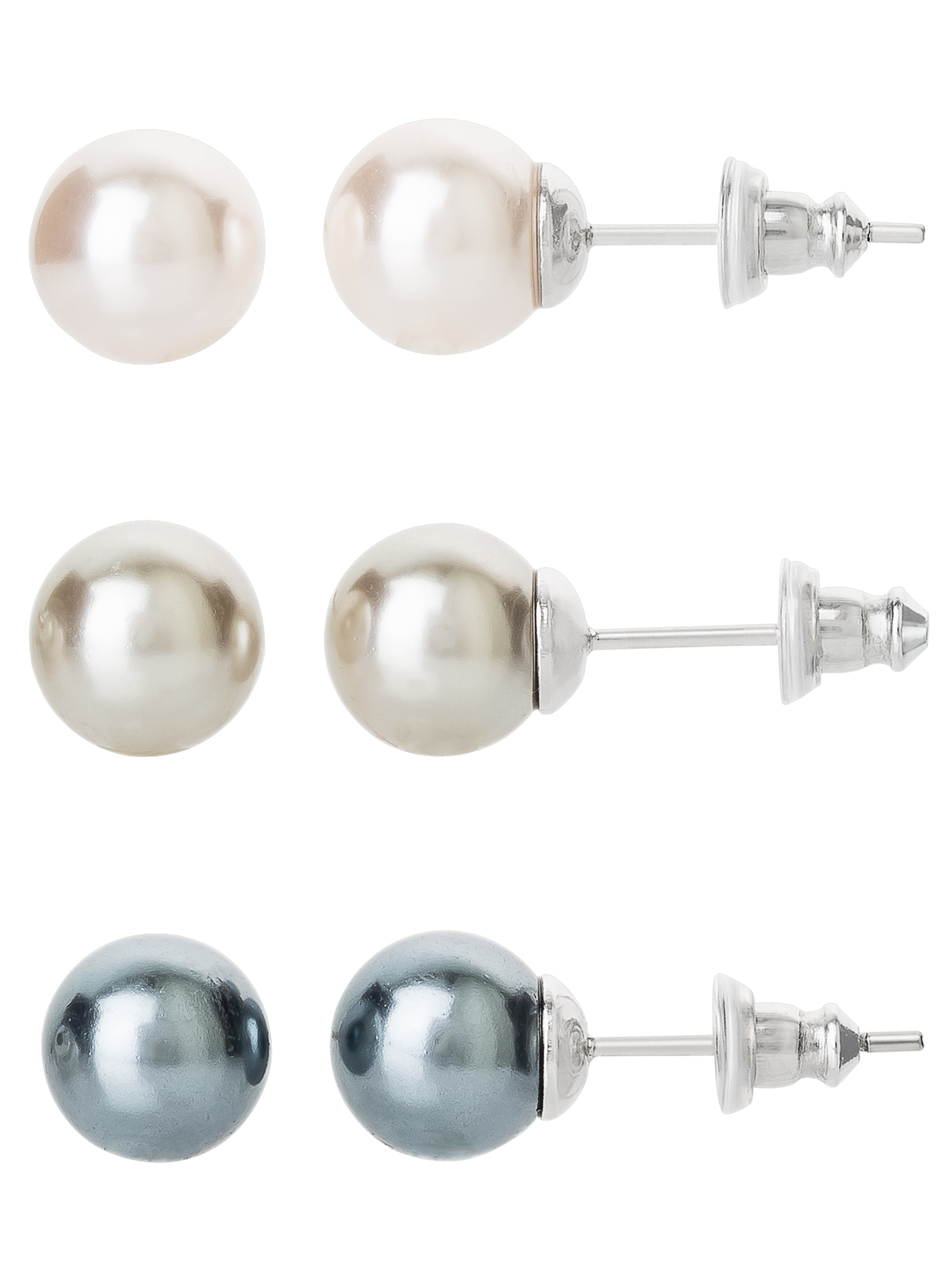 An updated classic addition to any wardrobe, these Fine Silver Plated Simulated Pearl 3 pair Earring Stud Set. The set features three 8mm simulated pearl studs. This set is the perfect addition to dress up an outfit for that speical occasion or eveyday. The earrings comes with friction back posts for a secure and comfortable fit. Each set comes packaged in a gift box with keepsake pouch making it an ideal gift for any gift giving occasion including including birthdays, Mother’s Day, Valentine’s Day, Christmas or just to treat yourself.