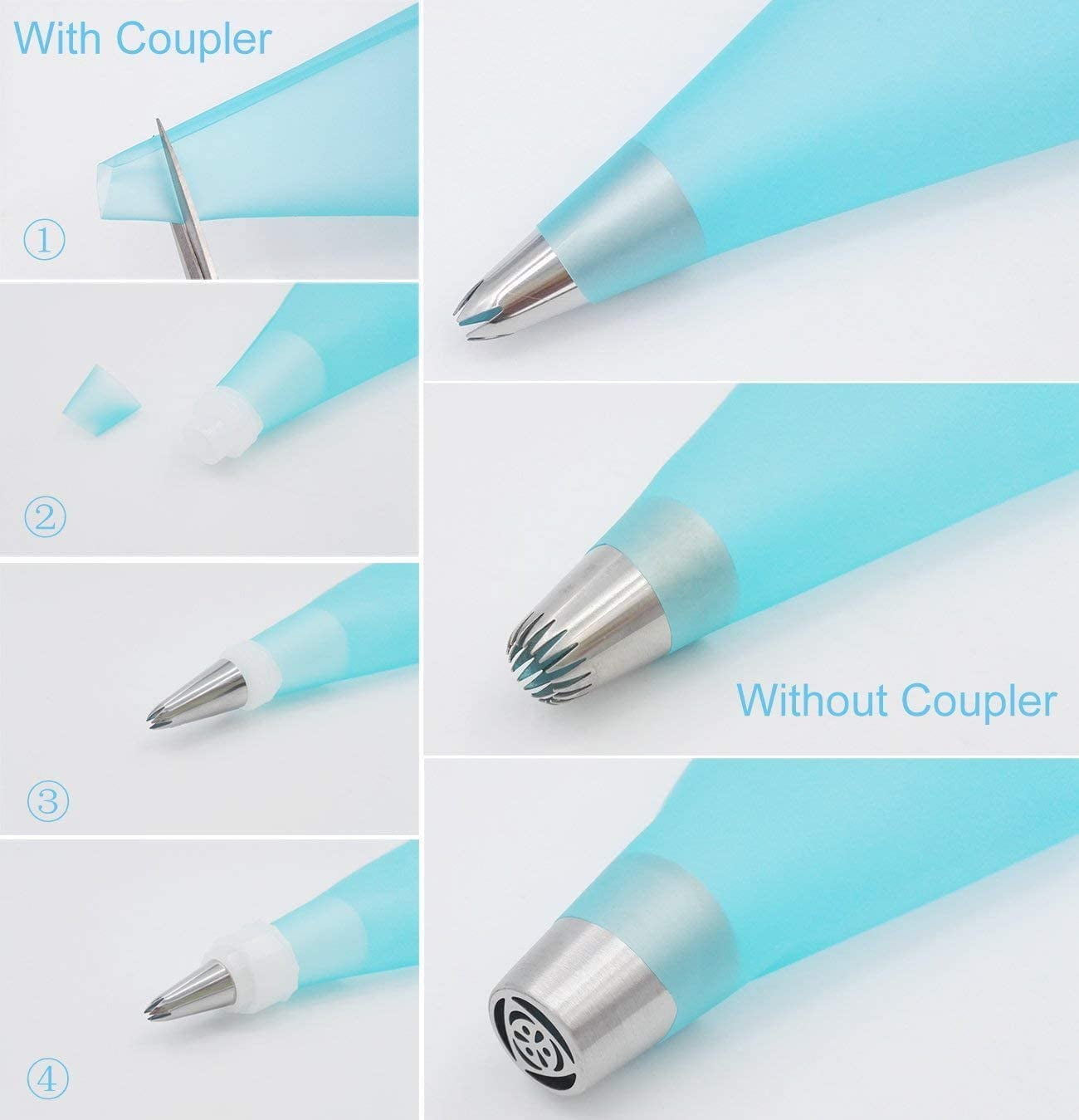 【Easy to Use】The cuspidal end is easily trimmed to fit your nozzles or tips. Screw on / off of coupler enables quick and easy nozzle changing. And you can make different patterns at once. To decorate cakes with your kids and friends, different icing colors or decorating patterns, you may need more than one piping bags.