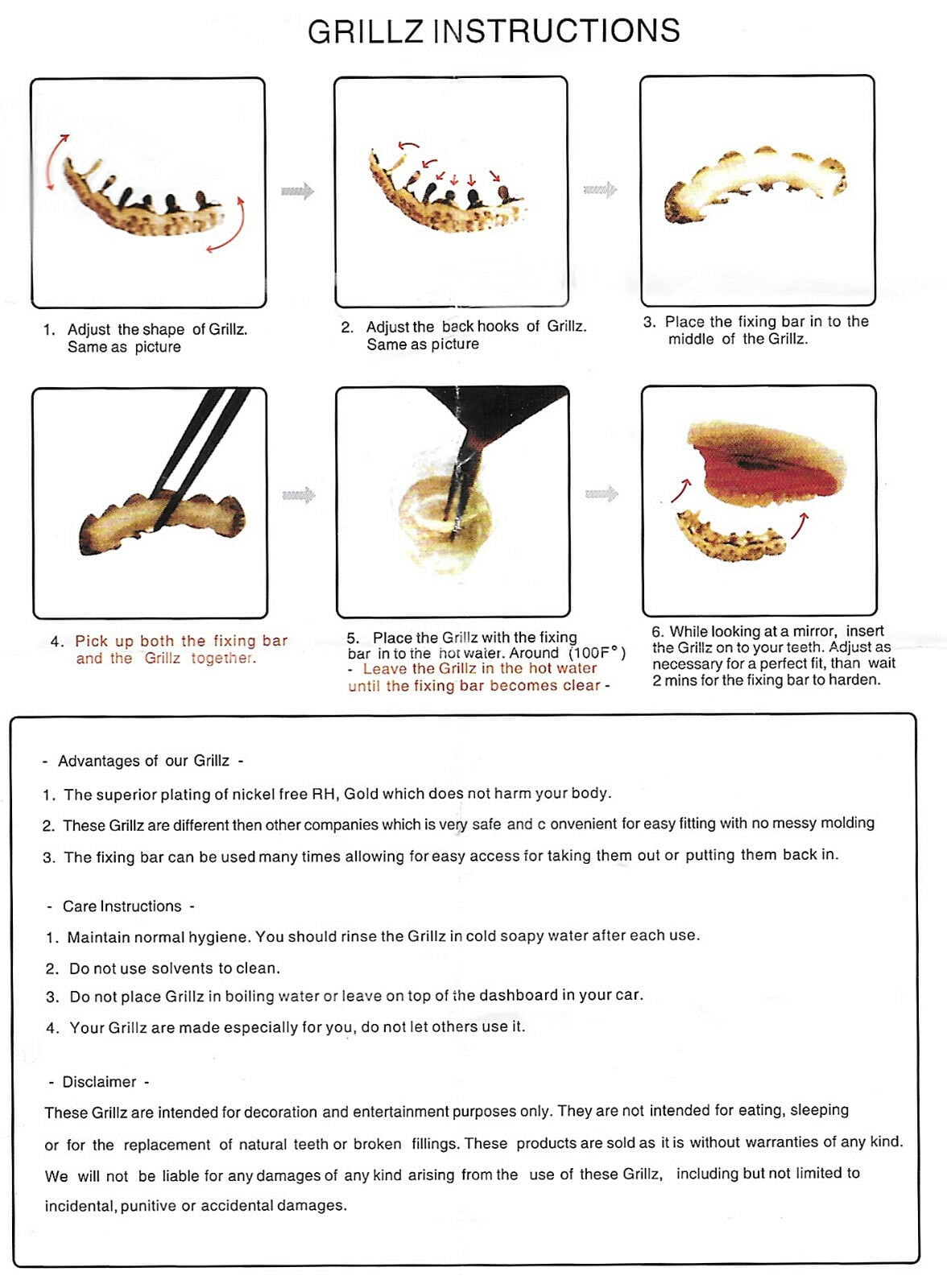 Men’s gold finish teeth grillz set with two silicone molding bars so you can star wearing your grillz right away. You get six teeth on top and six teeth on the bottom. Premade grillz are designed to fit most adult teeth. Includes easy instructions to fit in just five minutes using hot water – no need to return mold. Beautiful yellow gold finish over base metal. Safe to wear in mouth – nickel and lead free. Removable teeth grillz can be used over and over.