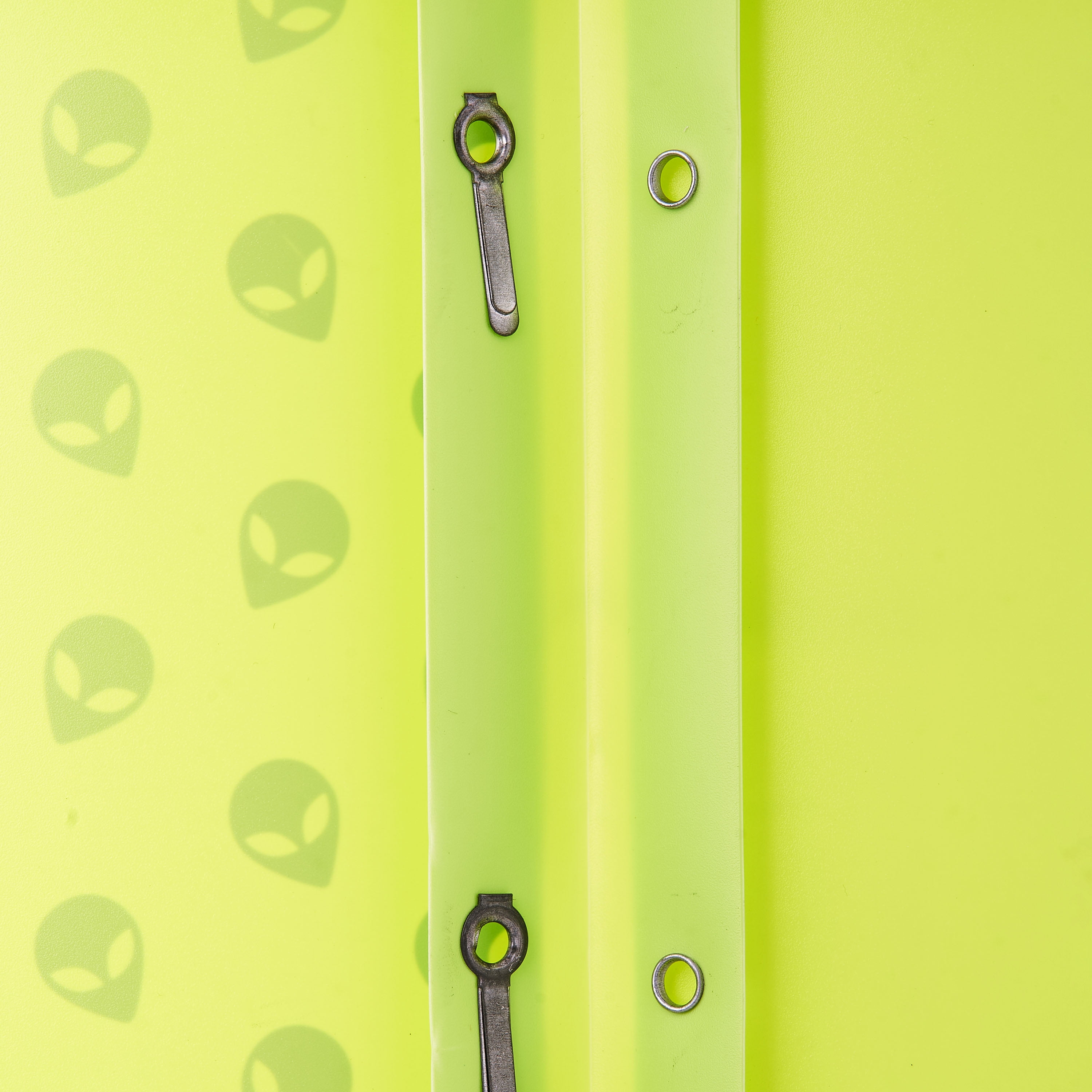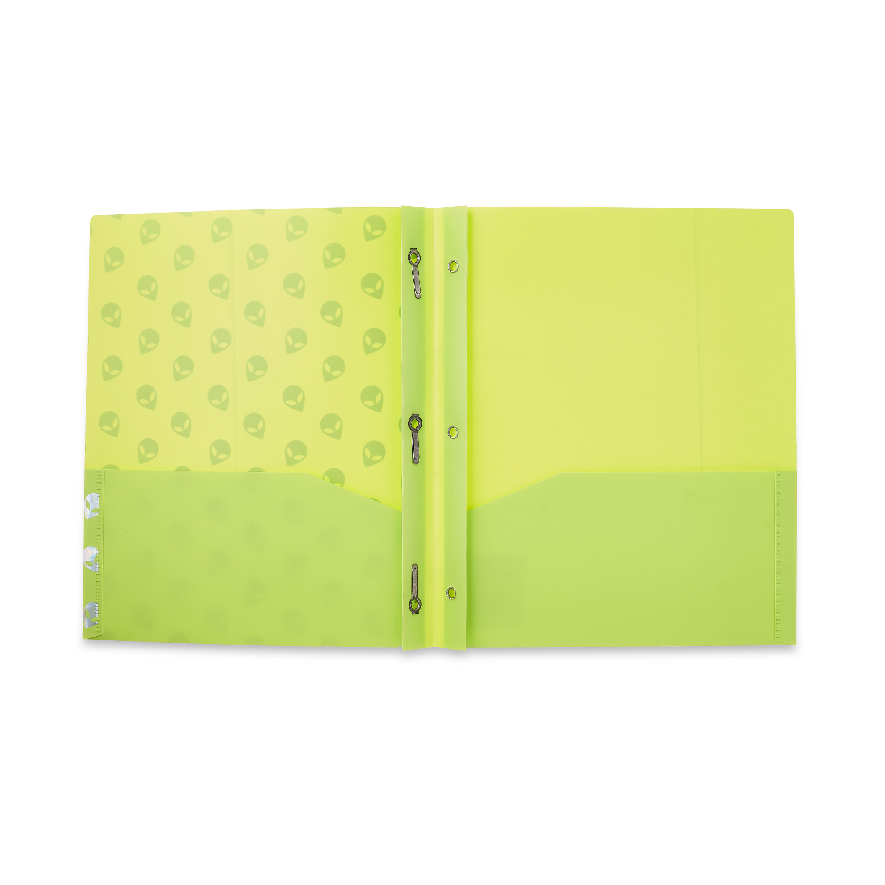 Keep papers in order with the Pen + Gear 2-Pocket Poly Portfolio with 3-Prongs. This folder is made with durable poly and is water resistant, so documents are safe from spills and tears. Featuring a green poly cover with foil aliens, you can keep your documents protected while remaining stylish. With 3-prongs you can securely store documents, take it with you to class, use it to keep important papers in one place, or store your tax documents. This folder has 2-pockets inside, so you can store handouts for any occasion. Measuring 9.4" x 11.4", you can securely store all your letter-size documents.