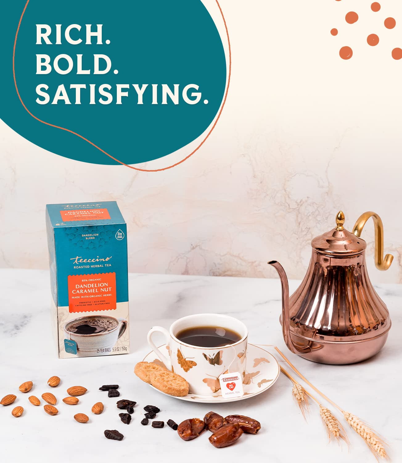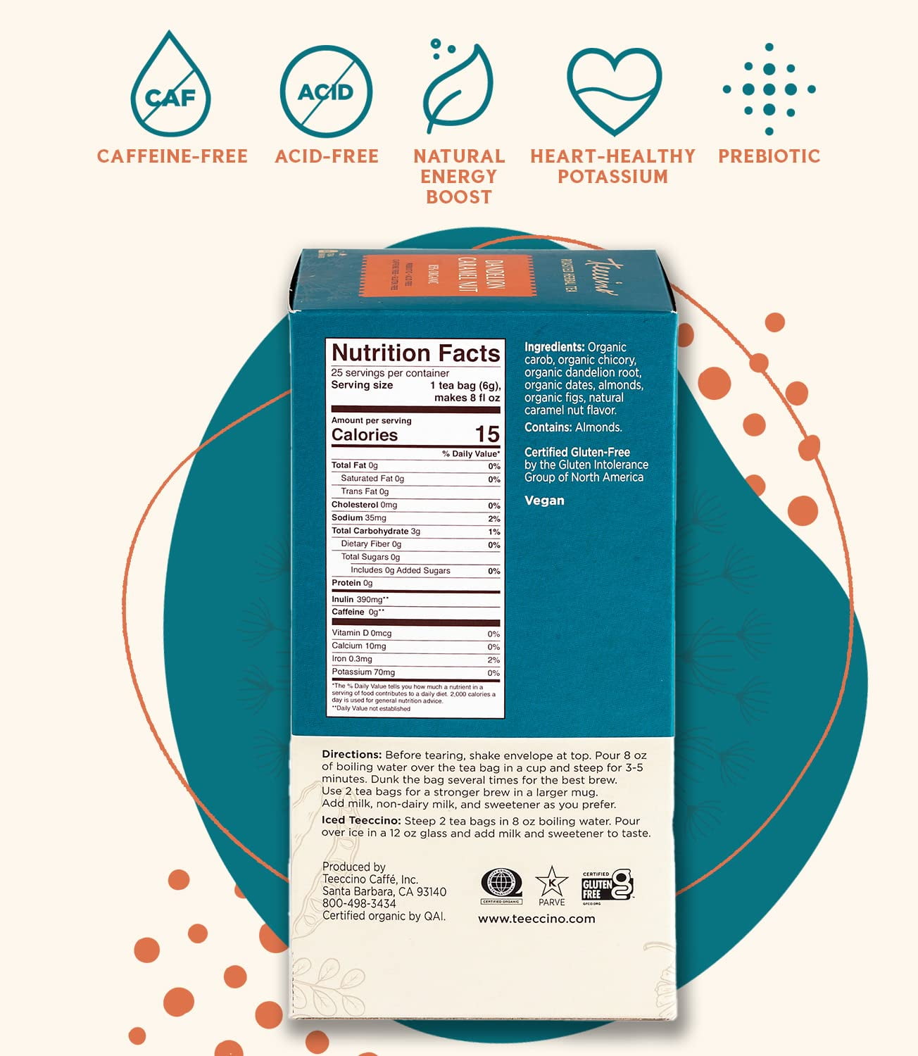 Teeccino Dandelion Caffeine-Free & Detoxifying Herbal Tea, Caramel Nut, 25 Tea Bags
