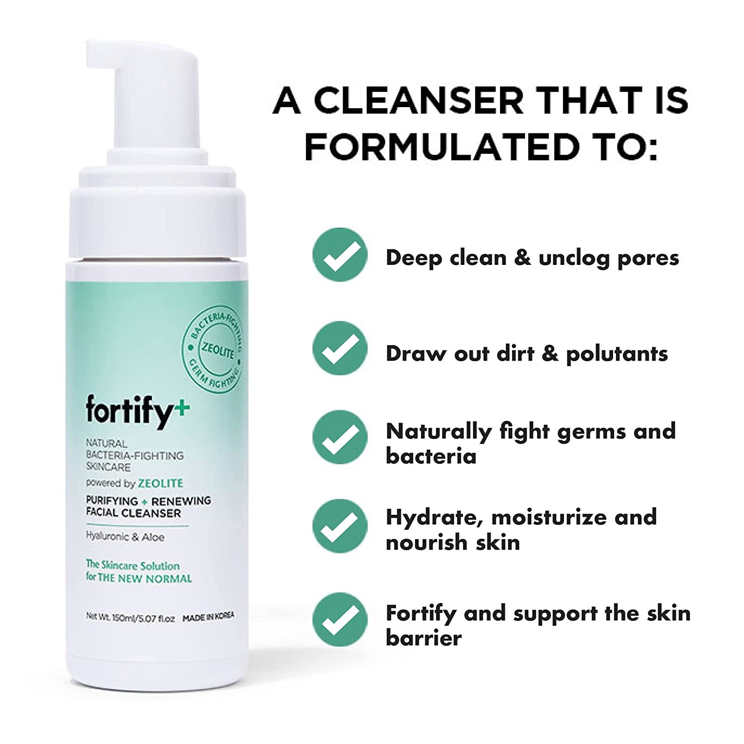 WHAT IT IS? Our Fortify foaming facial cleanser helps protect, purify and replenish skin. Different from other facial cleansers, this product not only deep cleanses, unclogs pores, and draws out dirt and pollutants, but also fights bacteria and germs that adhere to the face – without drying or damaging the skin.