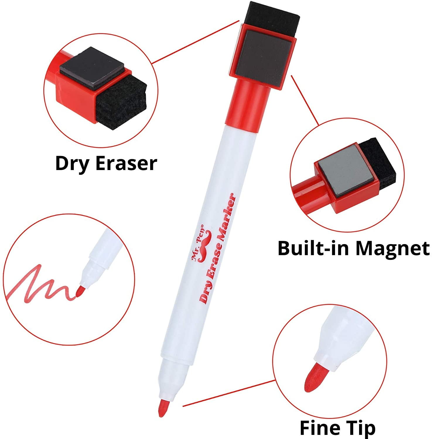 Mr. Pen package includes 8 magnetic dry erase markers in assorted colors with 1 magnetic whiteboard eraser Pen design with an eraser on cap causes comfort and efficiency. Fine point provides precise highlighting. Designed for use on different surfaces like whiteboards, glass and nonporous surfaces. They get clean easily from any dry-erase surface.
