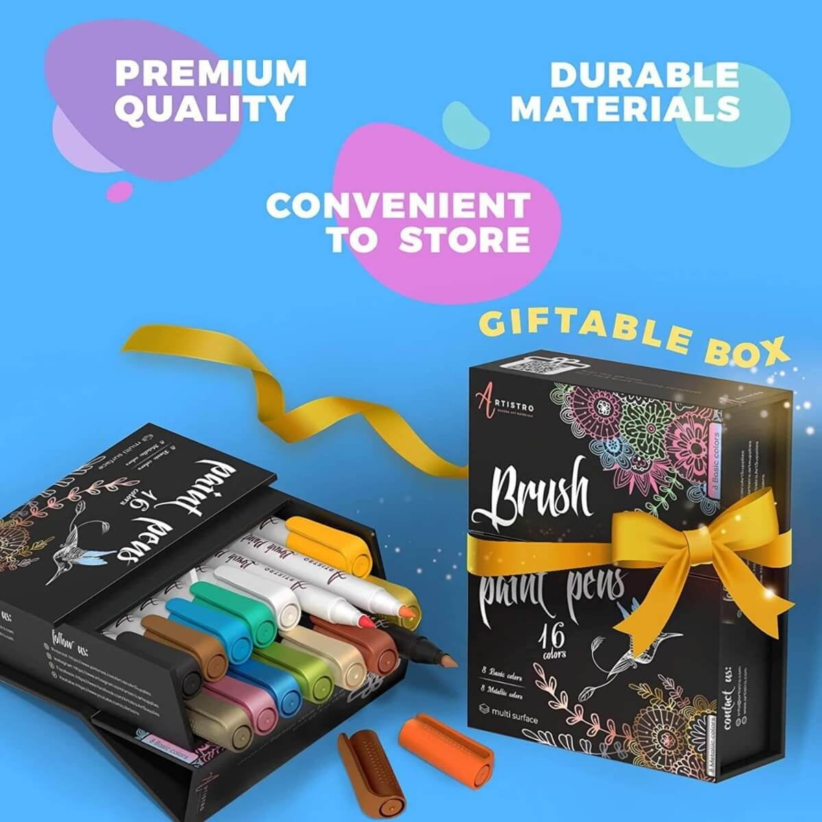 Artistro Watercolor Brush Tip Paint Marker Pens – Set of 8 basic & 8 metallic colors