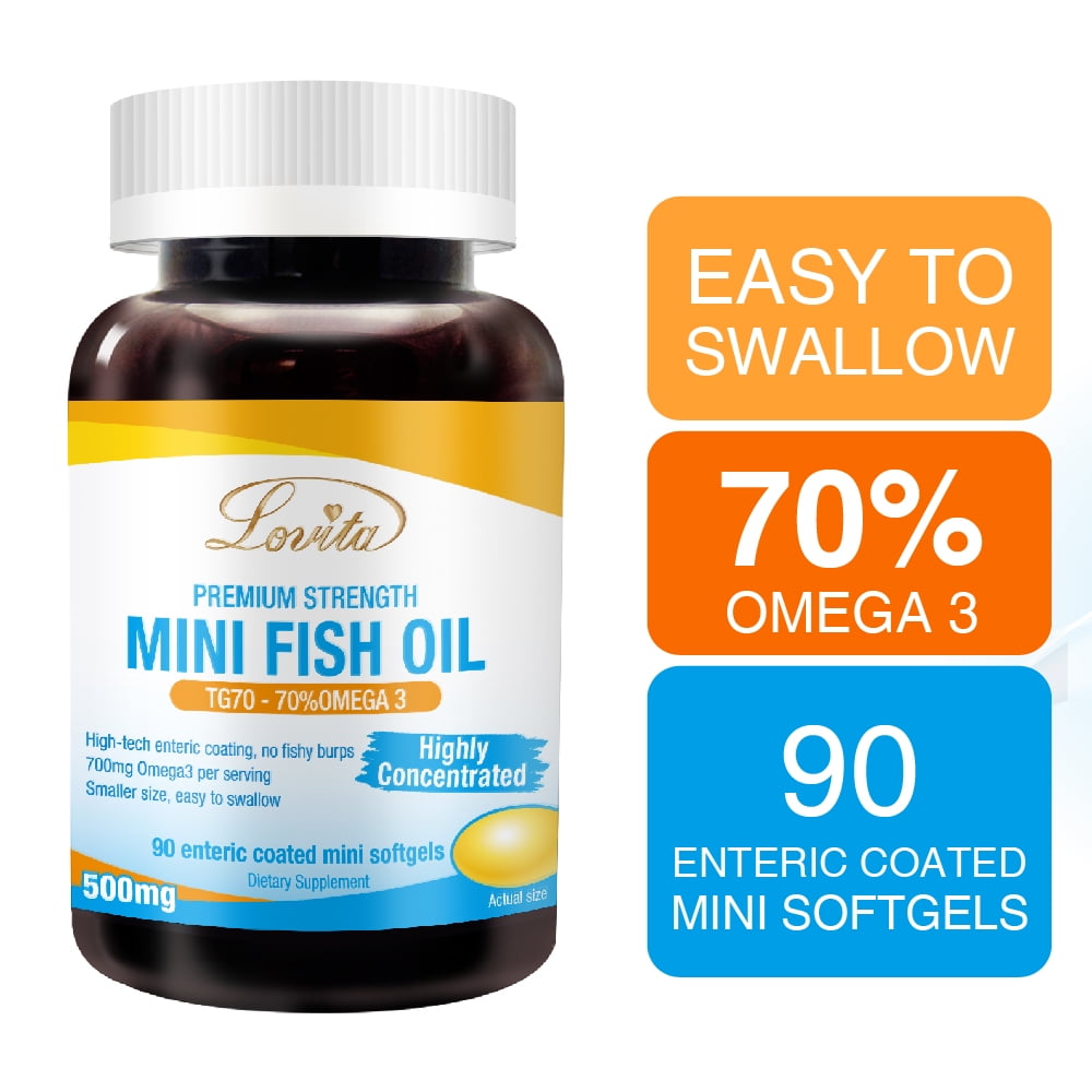 Lovita Mini Fish Oil 500mg, High Concentrated Omega 3, Easy to Swallow for Women and Senior, Burpless, 90 Enteric Coated Softgels