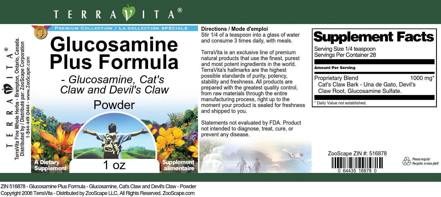 TerraVita Glucosamine Plus Formula – Glucosamine, Cat’s Claw and Devil’s Claw – Powder, (1 oz, 2-Pack, Zin: 516878)
