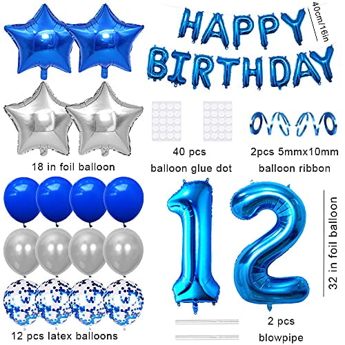 Xihuimay 12th Birthday Decoration Happy Birthday Banner Balloon 12 Year Old Birthday Party Supplies Helium Balloons 32′ Number 12 Balloon Confetti Latex Balloon Star Heart Foil Balloon, Blue Silver