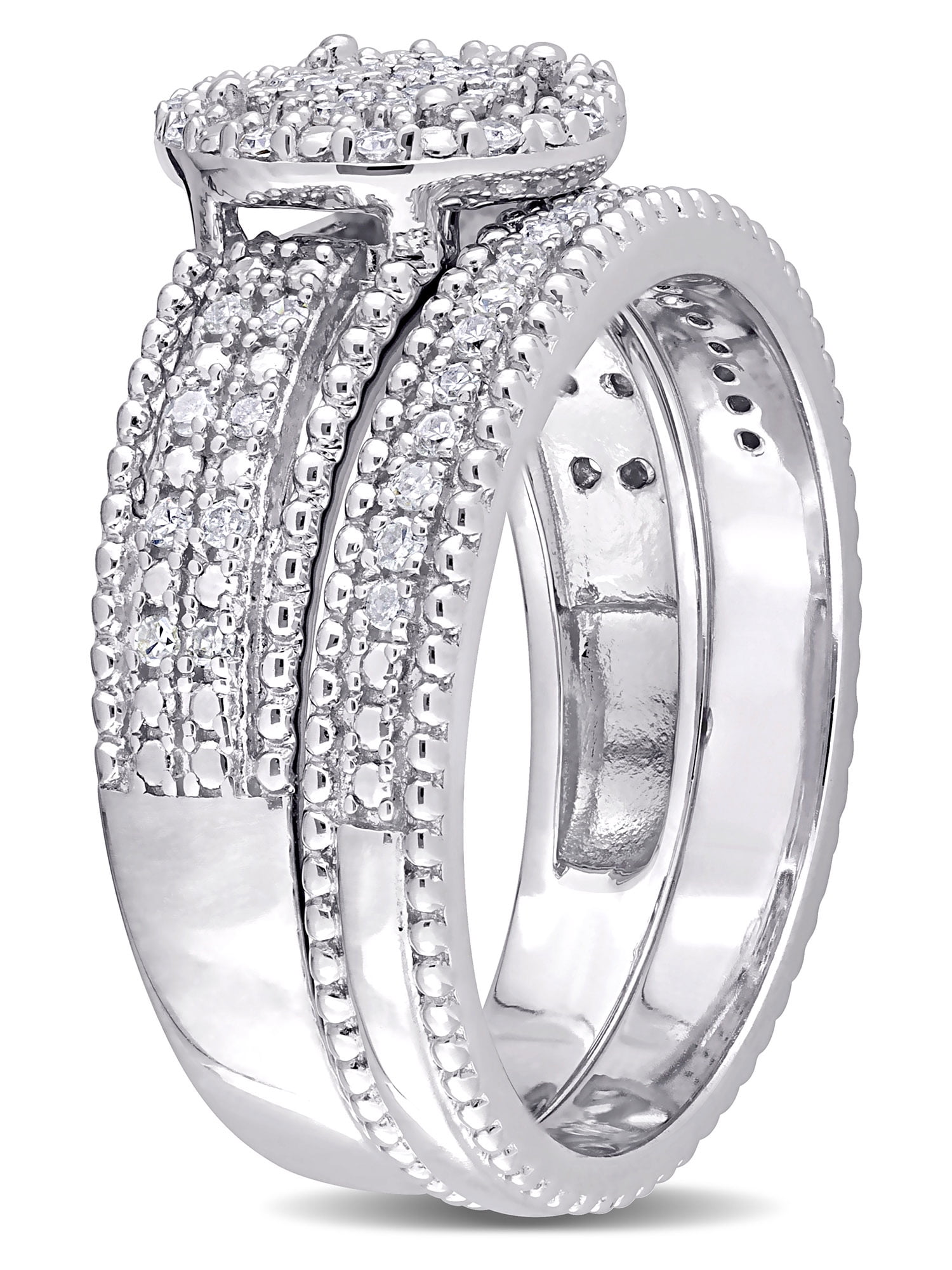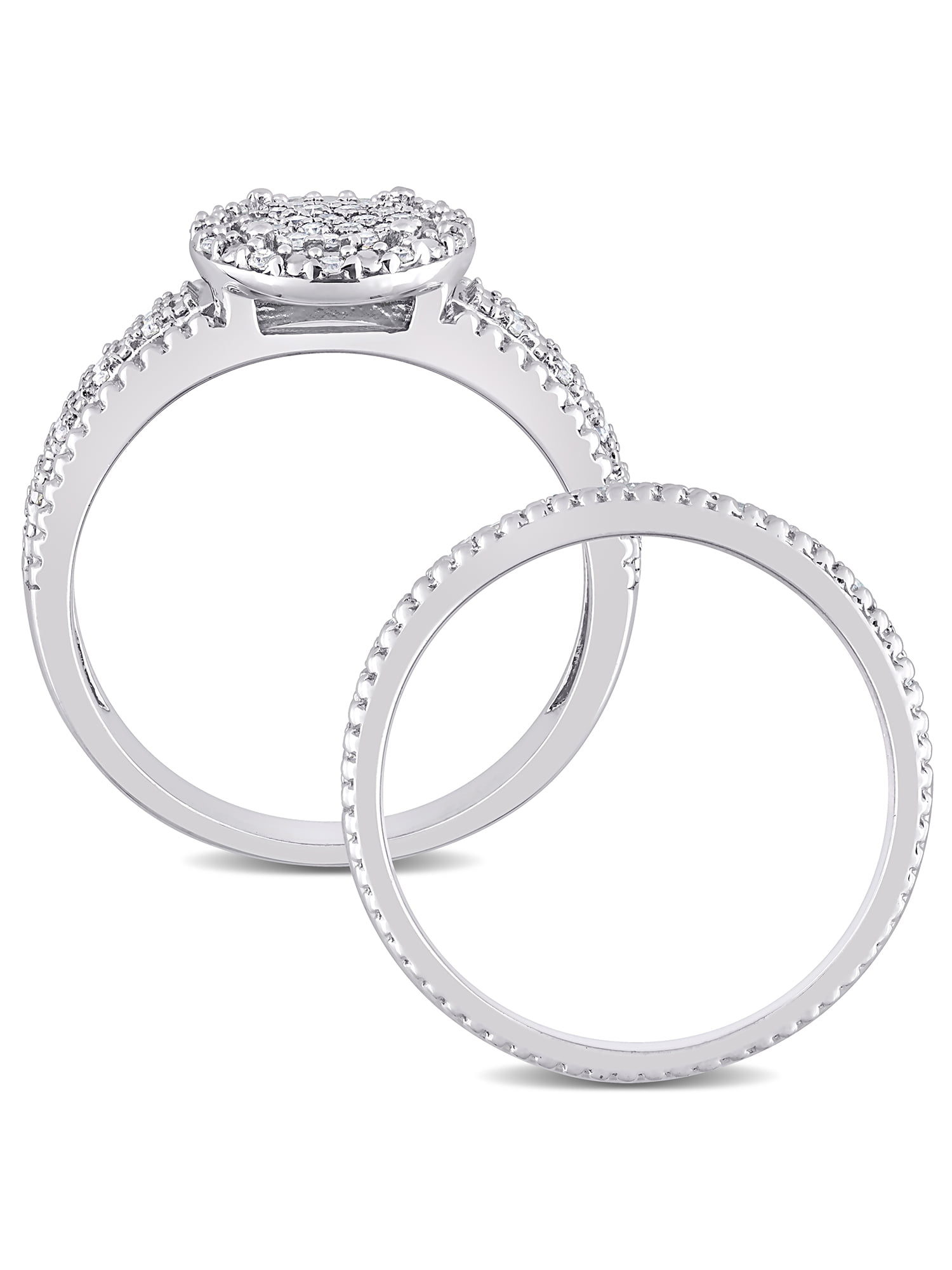 This luxurious Miabella Diamond Circular Halo Bridal Set is crafted in twinkling sterling silver and features 66 round-cut, prong-set diamonds (H-I, I3) beautifully embellished on halo engagement ring and also on its matching eternity ring. Buffed with luster, this bridal set will be a wonderful addition to any jewelry collection. Treat her to the sparkling look with this circular halo bridal set.