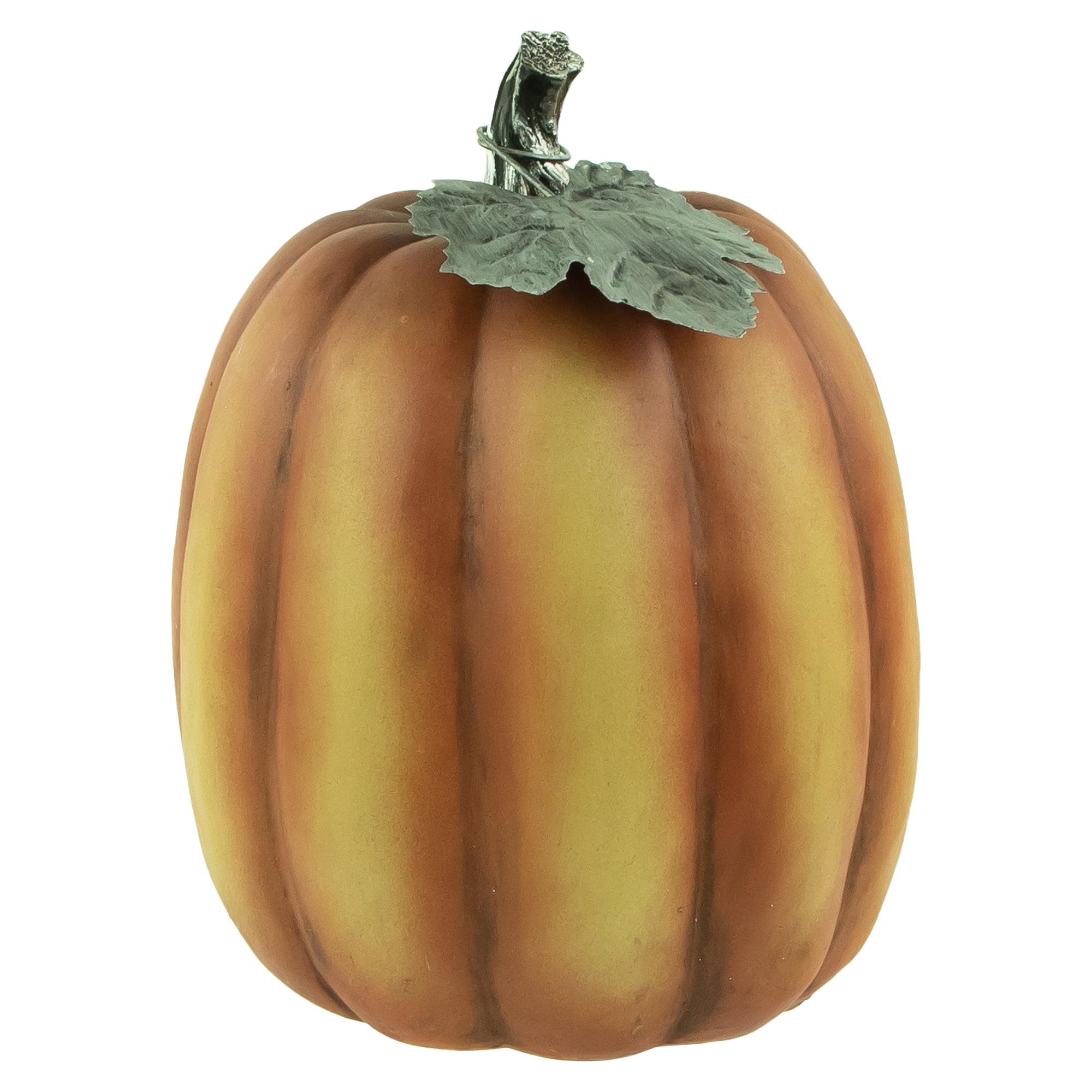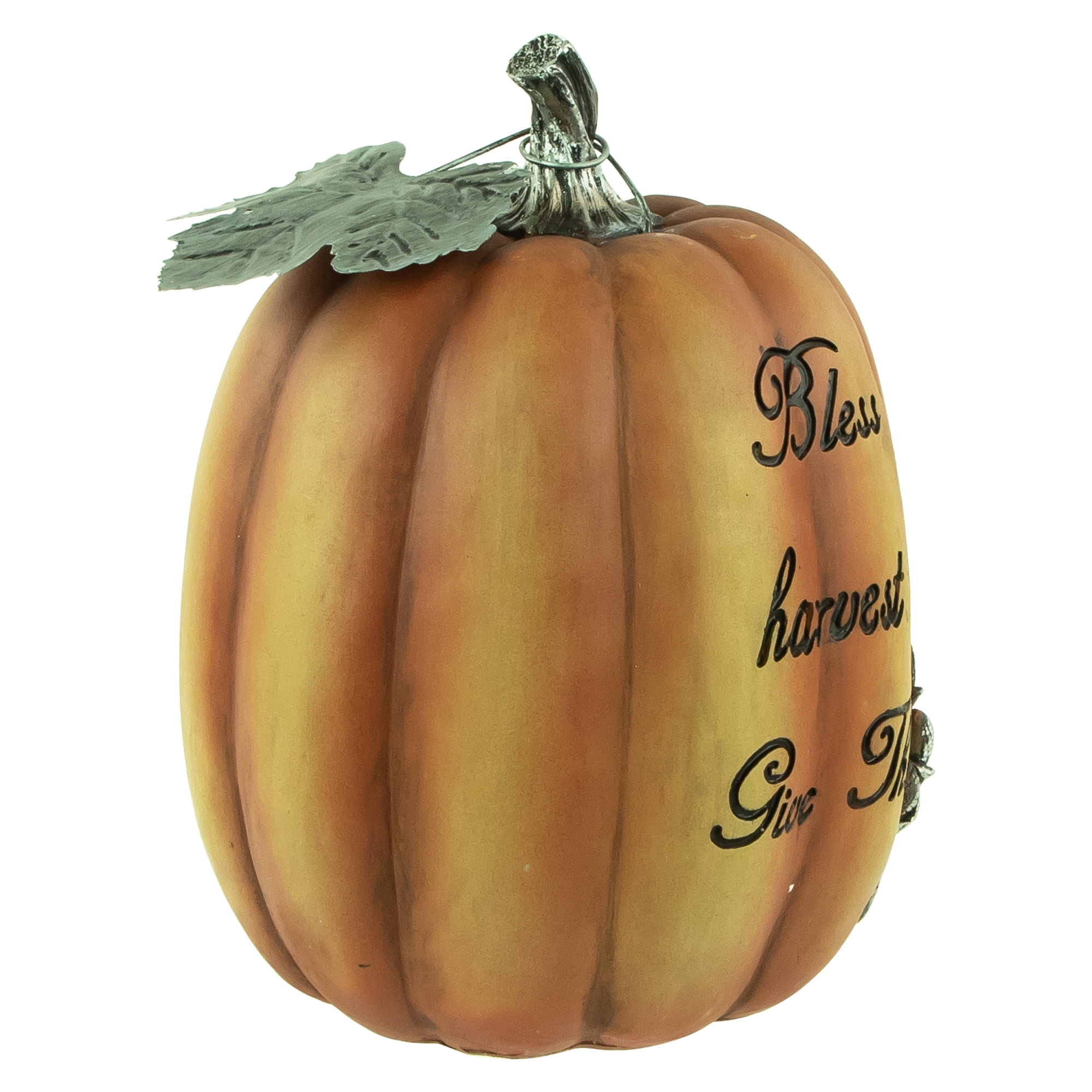 Capture the feeling of a crisp fall day with this beautiful pumpkin decoration. This orange pumpkin comes with metal accents and features the saying "Bless the Harvest and Give Thanks". This will be the perfect addition to your mantle, shelves, tabletop, or anywhere you wish to add a little holiday cheer. Product Features: Orange pumpkin fall harvest decoration. Features an orange pumpkin with "Bless the harvest and Give Thanks" in black print. Accented with silver metal vine and leaf at the top and silver metal corn and leaves on the side. Perfect addition to any Thanksgiving or autumn decor. For indoor use only. Dimensions: 10" high by 6.5" diameter. Material(s): polyresin