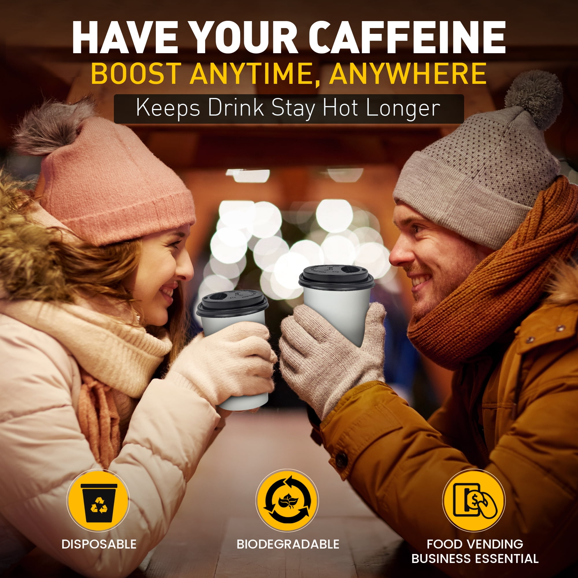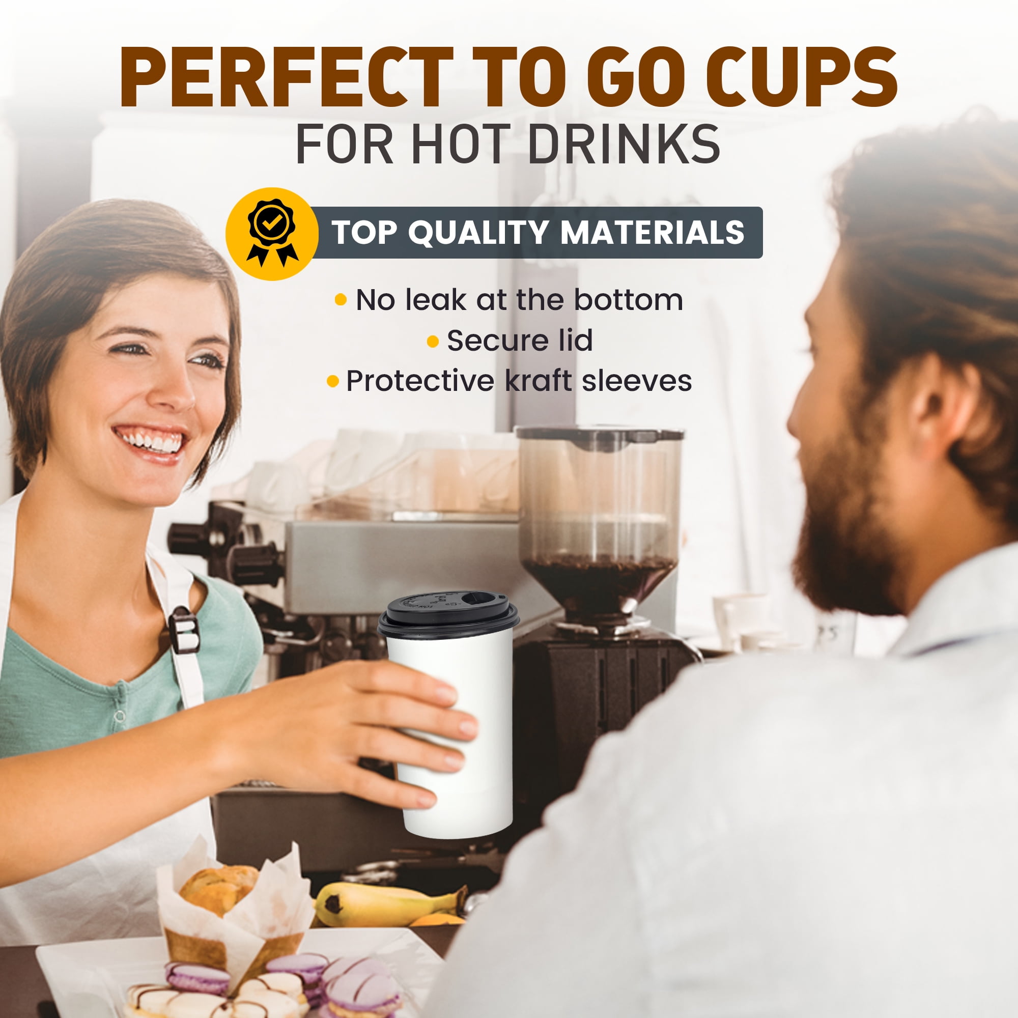 - PREMIUM QUALITY – Made out of poly-coated lining to prevent condensation. A high grade paper that is distinctively better quality than the rest! A white color cup and a black lid that will fit any style and theme!
