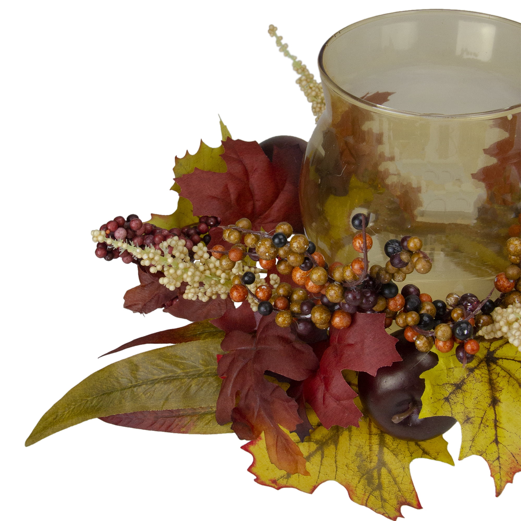 Add a touch of autumn foliage to your Thanksgiving holiday table with this gorgeous candle holder. The glass pillar candle holder is accented with maple leaves, berries, and apples surrounding the base of the holder. You can place this candle holder on an end table, dresser or on your mantel. Features; Hurricane glass pillar candle holder Featuring red, orange, green, yellow maple leaves Berries and apples accent the leaves Amber hurricane glass adds to the autumn flair Holds (1) pillar candle – not included Makes a perfect centerpiece, whether you use a candle or fill it with your favorite treats Recommended for indoor use only Dimensions: 6"H x 15"W Glass dimensions: 6"H x 4.5"W Material(s): plastic/foam/glass