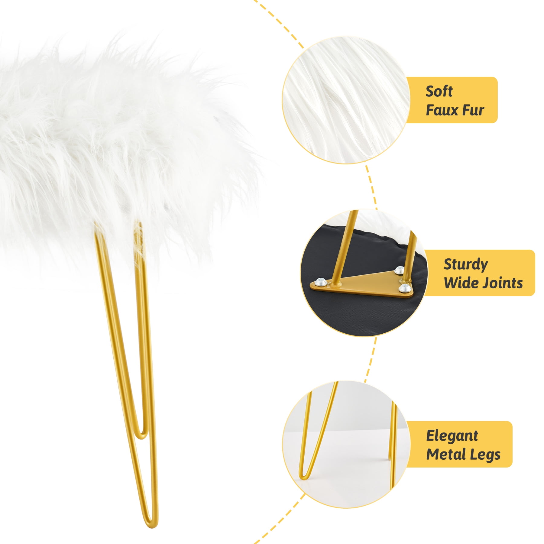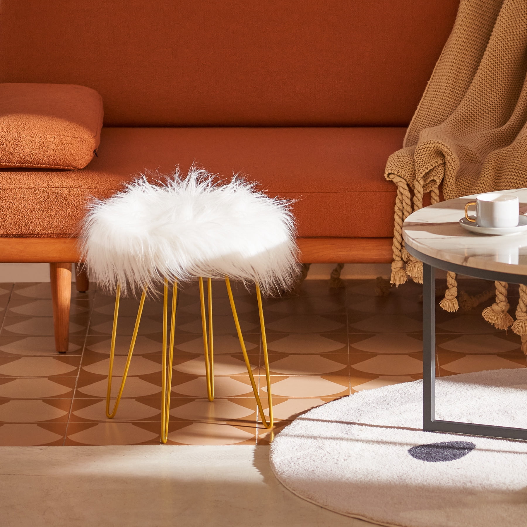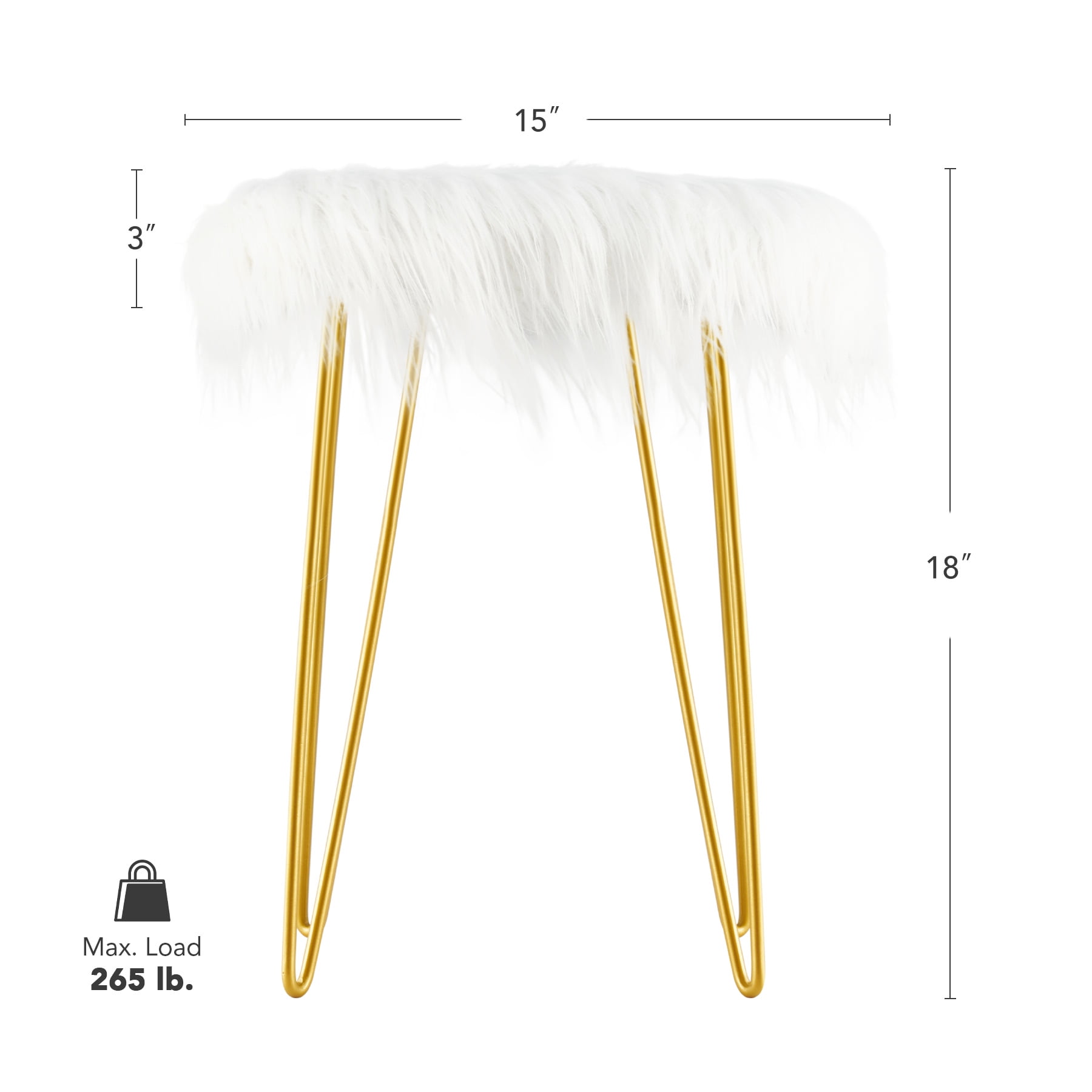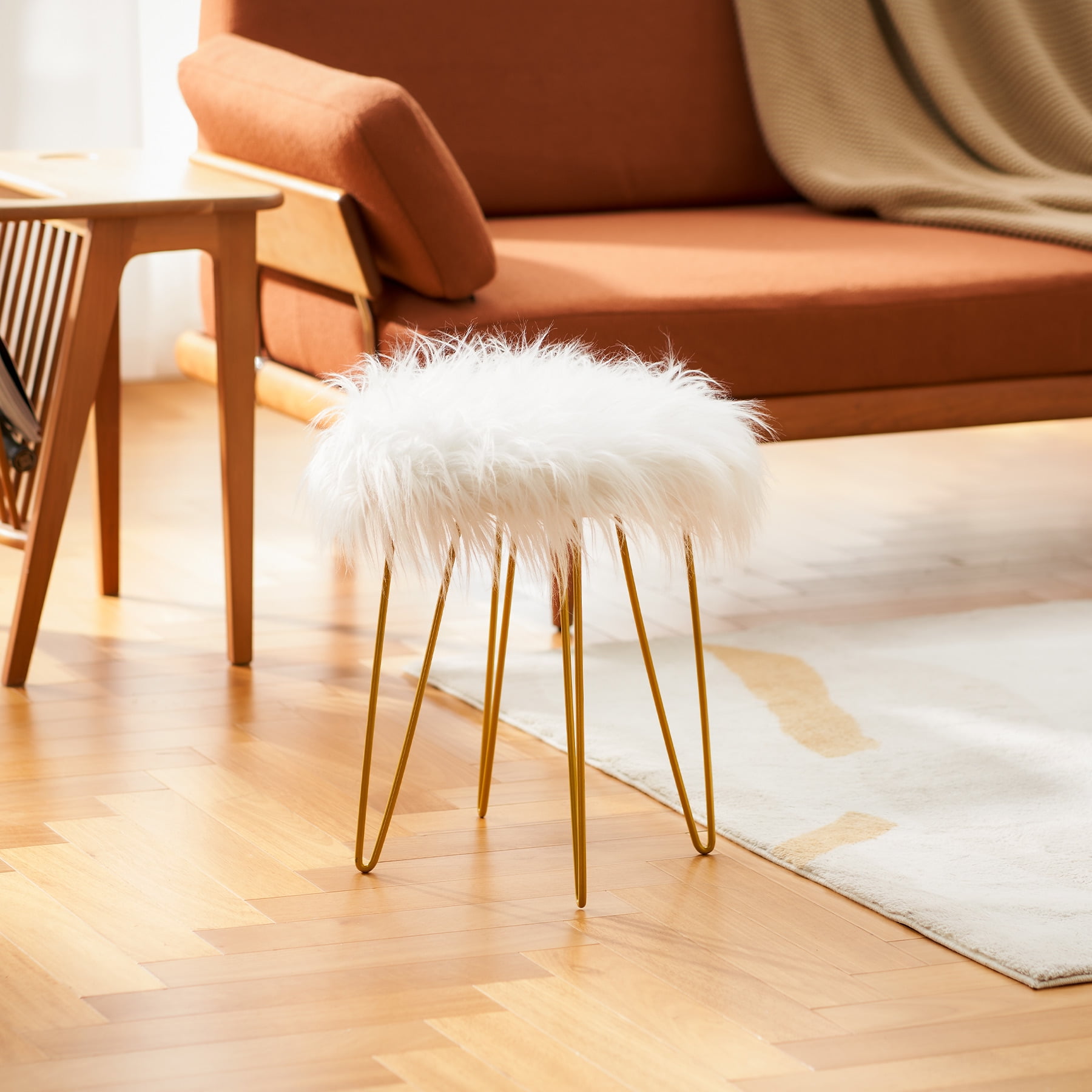 Our 15 inch wide vanity stool has got you covered! Inspired by vintage glamour, this simple yet sophisticated vanity chair rises to the occasion combining a sumptuous faux fur upholstery with the modern comfort of its 3 inch thick dense foam padding. Holding up to 265 pounds, this sturdy and stable accent chair offers years of reliable use thanks to its corrosion resistant metal base. Whether used as a living room foot stool, dressing table stool, bedroom seat, or hallway shoe changing stool, this comfy and compact seat brightens any space in your home. Standing alone or paired with your favorite armchair or table, this versatile furry chair offers plush comfort while you get ready for the day or simply kick your feet up while you sip your morning coffee.