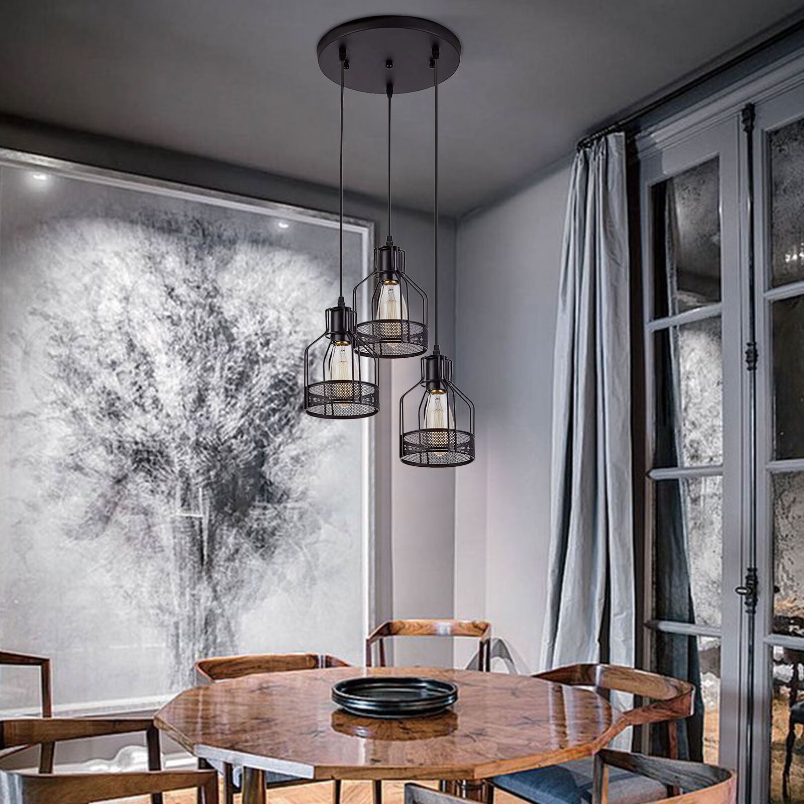 Wuzstar Vintage Metal Cage Pendant Lights 3-Lights Adjustable Height Hanging Lamp Fixture
