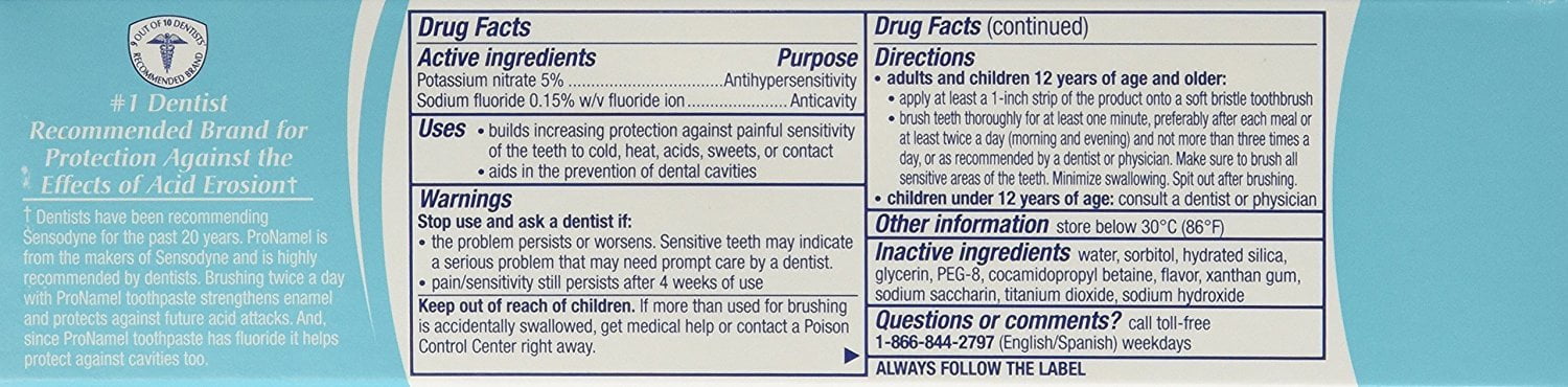 ProNamel products help to protect your enamel from the effects of acids found in everyday foods and drinks, which can lead to acid erosion. ProNamel toothpaste is the #1 dentist recommended brand for protection against the effects of acid erosion. ProNamel toothpaste is an enamel care toothpaste that has been specifically formulated to help protect against the effects of acid erosion – as well as relieving the sensitivity that can accompany acid erosion. ProNamel products are formulated to re-harden acid-softened tooth enamel. Use ProNamel products to protect your teeth, keep them healthy and strong, and maintain their natural whiteness. 9 out of 10 Dentists Recommend Sensodyne Toothpaste Three pack