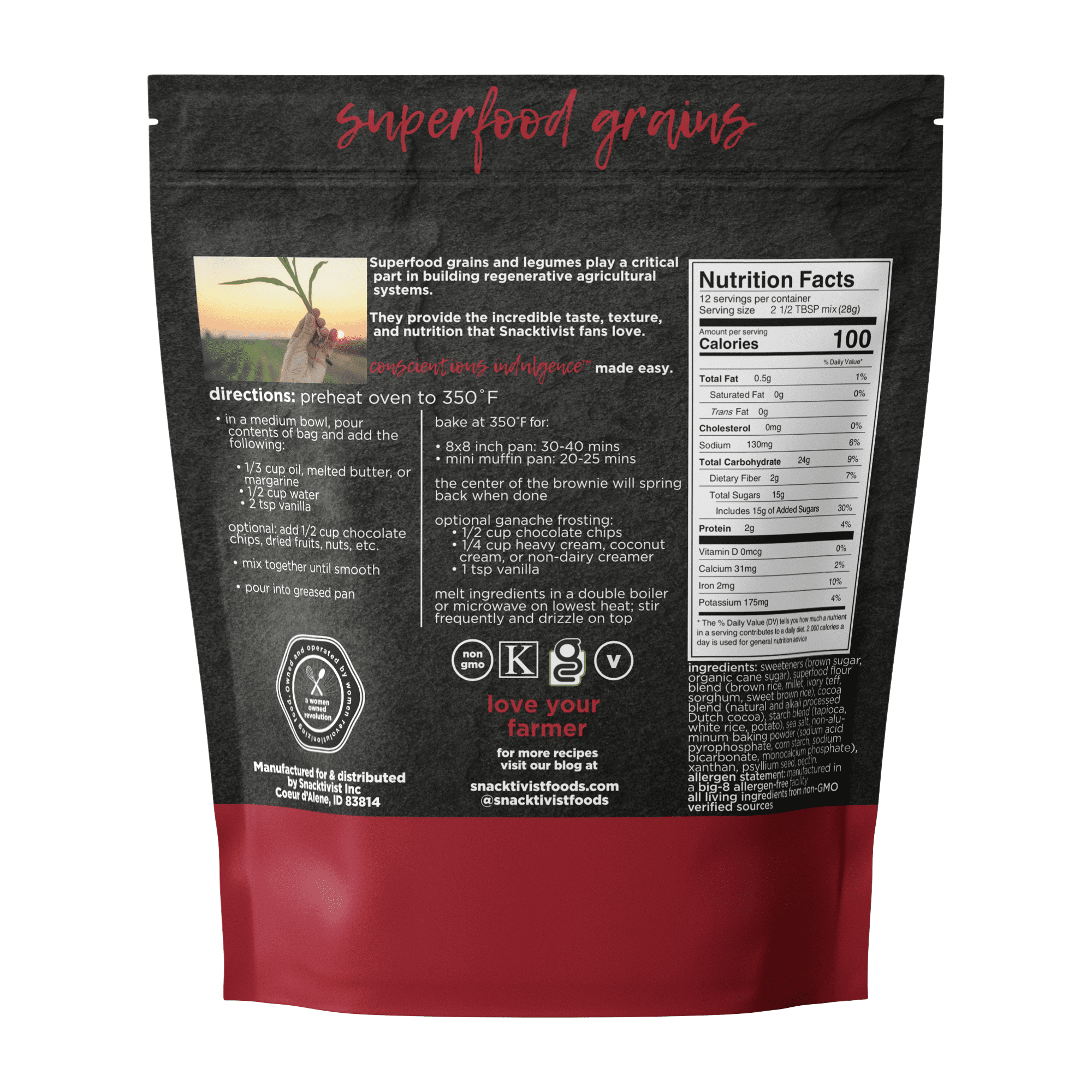 Snacktivist Foods Dark Chocolate Brownie Mix, 12 Oz Pack of 3 You never knew you were missing this in your life. Now you do. Plant-based, vegan, naturally gluten-free, and deliciously decadent. Double the chocolate; half the guilt. You can thank us later.