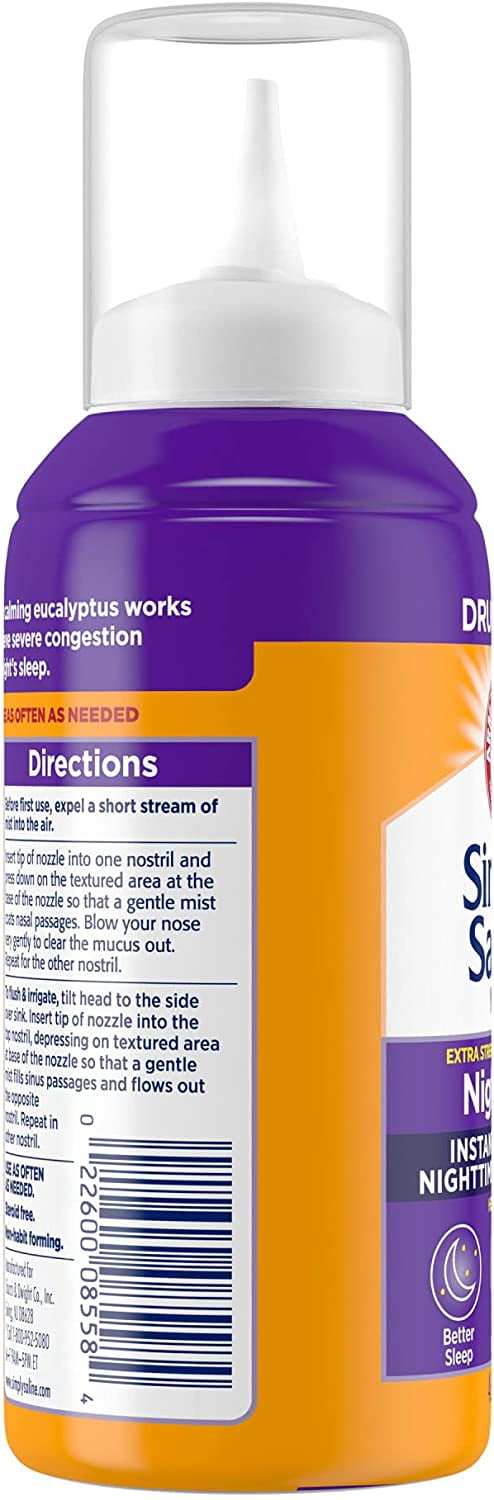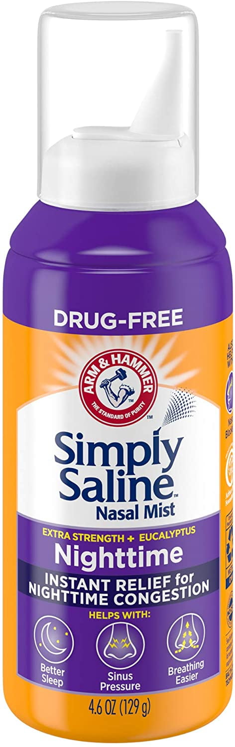 This nighttime nasal spray helps relieve cold and allergy congestion, and is made with soothing eucalyptus for better sleep. Simply Saline contains ARM & HAMMER Baking Soda for a drug-free way to dry mucus, clear nasal passages, and reduce snoring, making it safe to use with your cold or allergy medicine. Plus, its adaptable nozzle and gentle mist make it easy to use. To breathe easier and sleep better, try ARM & HAMMER Simply Saline Extra Strength- Nighttime Formula plus Eucalyptus. Pack of 3