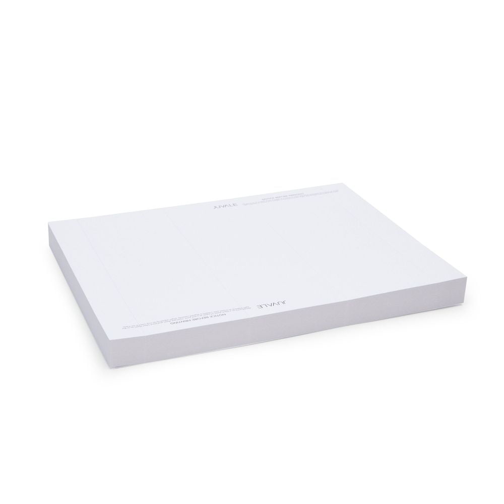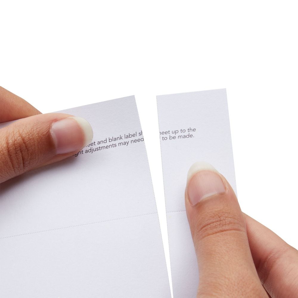 Create your own customized business cards or labels with this set of printable paper sheets. These rectangular cards feature perforated lines and a blank design that can be printed for customization. To prepare these cards simply fold each of the 100 sheets inwards, carefully tear towards the center, fold the sheets along the top and bottom to remove the 2 horizontal pieces, then fold along the lines to create the individual cards. Each white sheet of paper measures 8.5 x 11 inches and folds down to 300 individual cards that measure approximately 5 x 3 inches. Ideal for standard business sleeves.