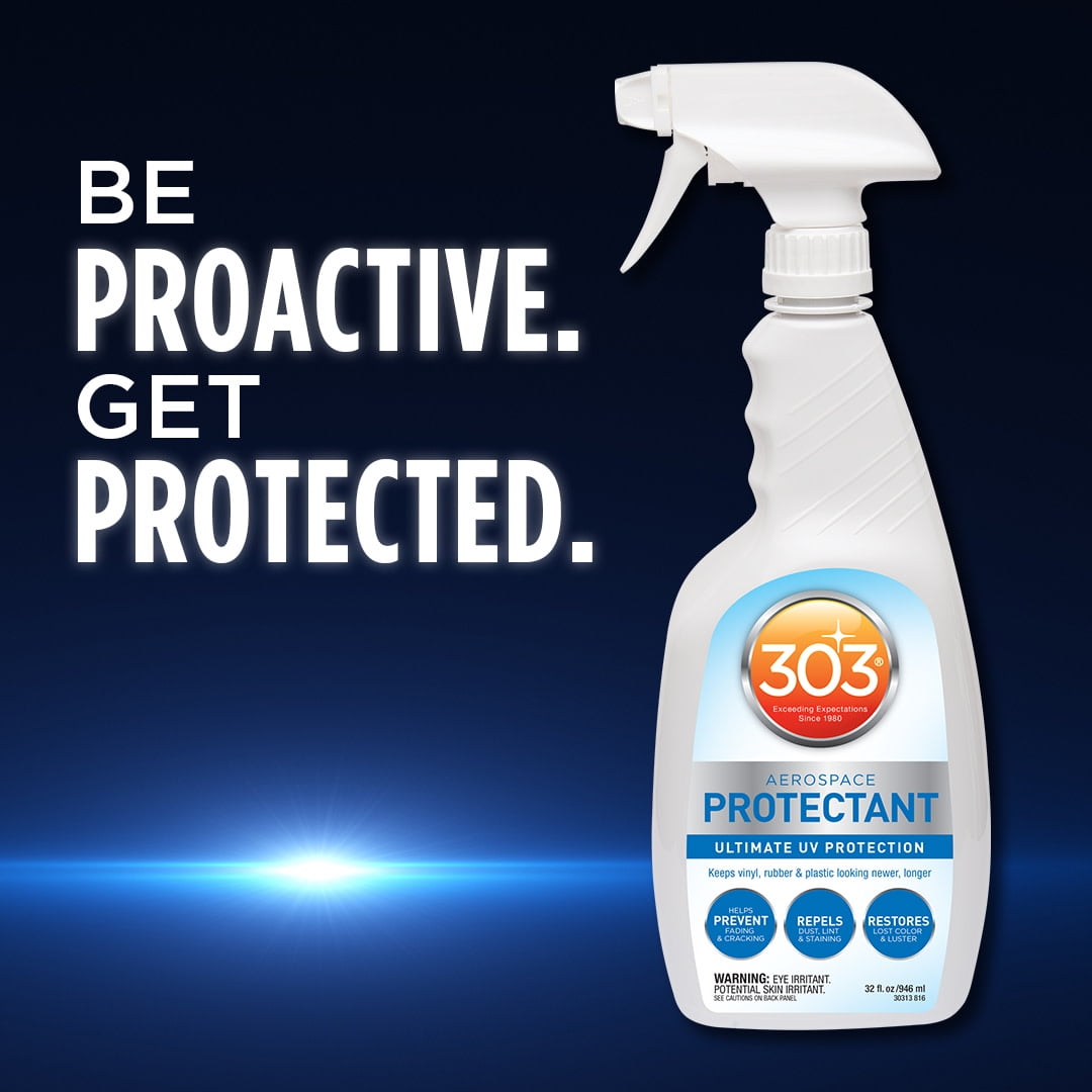 Originally engineered for aerospace and aviation applications, 303 Aerospace Protectant has found its way into millions of homes for day-to-day use on vehicles, sports equipment, patio furniture accessories and more. Unlike many protectants that leave greasy residues, Aerospace Protectant dries to a clear matte finish. And because it’s water-based, this protectant is safe to use on all products, from your vehicle’s paint job and leather seats to internal engine parts. There’s a lot of power packed into this one product. A premium surface treatment, Aerospace Protectant not only protects against fading, discoloration and cracking from harmful UV rays, but repels dust and stains, too. Simply spray on and wipe dry for a beautiful, matte finish that protects your vehicle from road grime and favorite belongings from dust and soiling. Best of all, each application will last for months. No other protectant beautifies as intensely or preserves as powerfully. Keep UV-sensitive materials looking new, year after year. Great for use on a variety of surfaces such as: vinyl, leather, plastics, synthetic and natural rubber, PVC, gel coat and fiberglass. Ideal for: Hypalon inflatable boats, wet or dry suits, tires, side-out seals, RV EDPM rubber roofing (for your safety, never walk on a wet roof), helmets, visors, and goggles. Not for use on unfinished leathers (such as suede), fabrics (canvas), floorings, clear plastics, gauge panels, or headlights.
