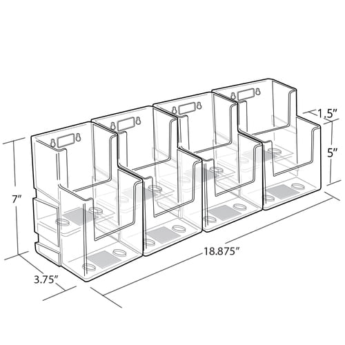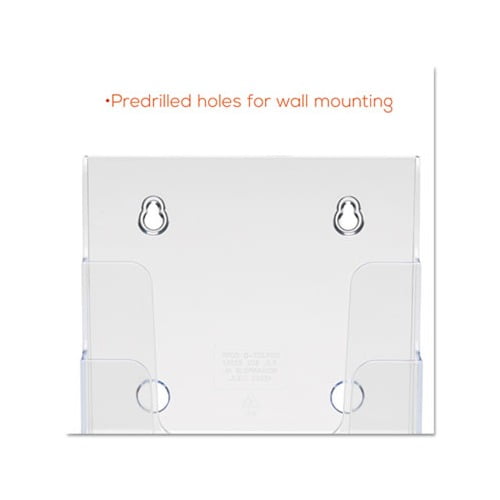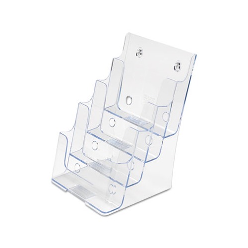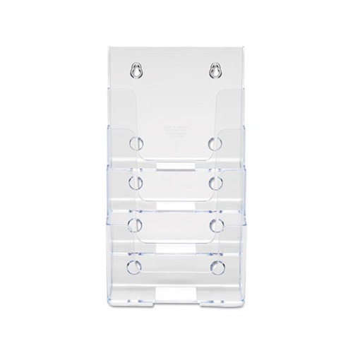 Compact, clear plastic holder. Tiered design offers better visibility and space efficiency. Design is ideal for financial institutions, government buildings, lobbies, libraries and more. Use on countertop or wall-mount mounting hardware not included. MediumFor booklets up to 1 1/16" capacity. Color: Clear Color Family: Clear Overall Width: 6.88" Overall Depth: 6.25".