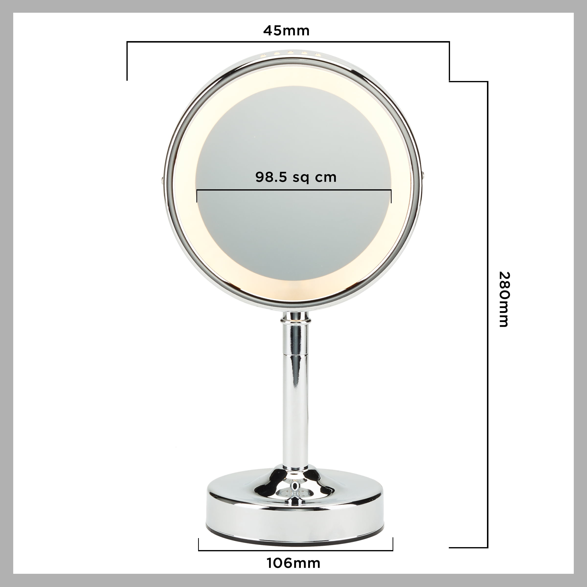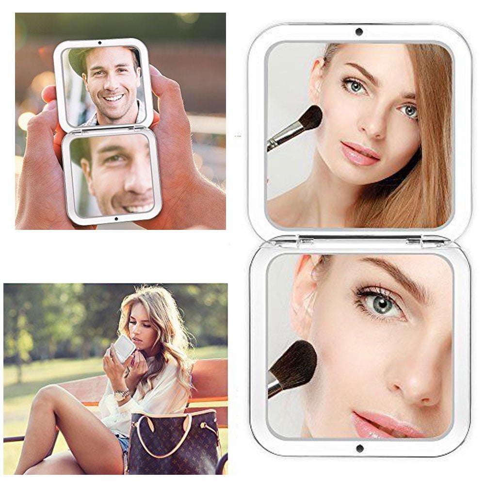 Double sided mirror measures: 2 3/4" x 2 3/4" approximately. Perfectly fits into purses, backpacks, office drawers and more. Great for detailed application of make-up or eyebrow grooming.