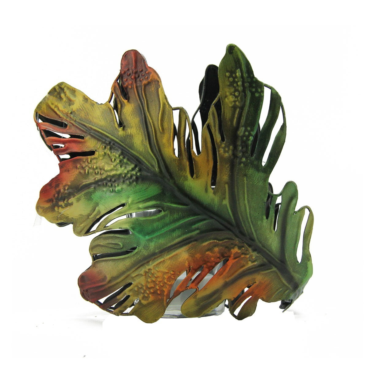 Add this beautiful candle holder to your Thanksgiving day table! It instantly modifies your space to the peak of elegance. Get to witness the festive ambiance it delivers!. Product Features: Multi colored metal oak leaf Thanksgiving candle holder. Holds (1) votive candle – not included. Recommended for indoor decorative use only. Dimensions: 5.25"H x 6"W x 3.25"D. Material(s): metal/glass