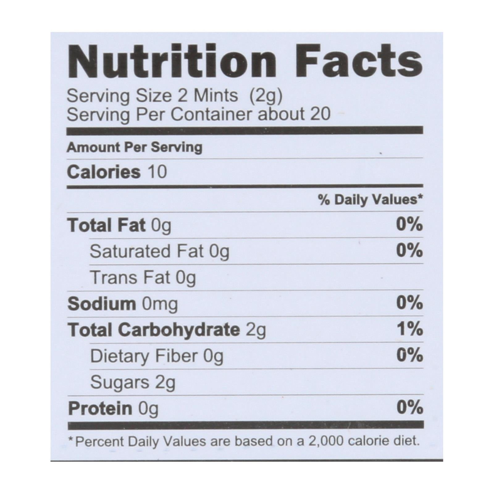 VERMINTS CINNAMON BREATH MINTS ARE A 100% USDA-CERTIFIED ORGANIC PRODUCT. THIS 1.41 OZ. TIN OF VEGAN MINTS IS ALSO CERTIFIED NON-GMO, AND THEY ARE A GLUTEN-FREE, DELICIOUS WAY TO FRESHEN YOUR BREATH. WITH ONLY 2 G. OF SUGAR PER SERVING, THEY ARE ALSO KOSHER AND NUT-FREE. SEE NUTRITION FACTS PANEL FOR ALLERGENS.