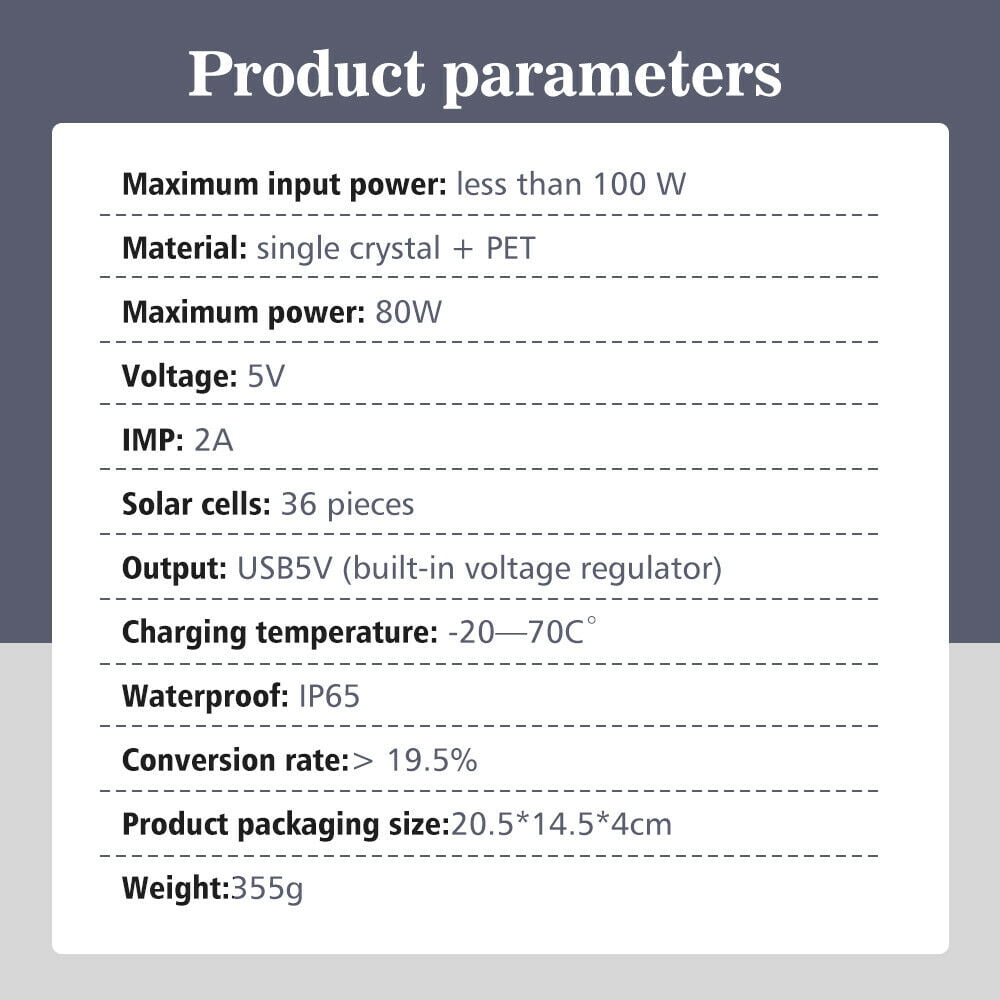 - Power Max: 80W, Vmp: 5V, Imp: 2A, Output: USB 5V(built-in voltage regulator)