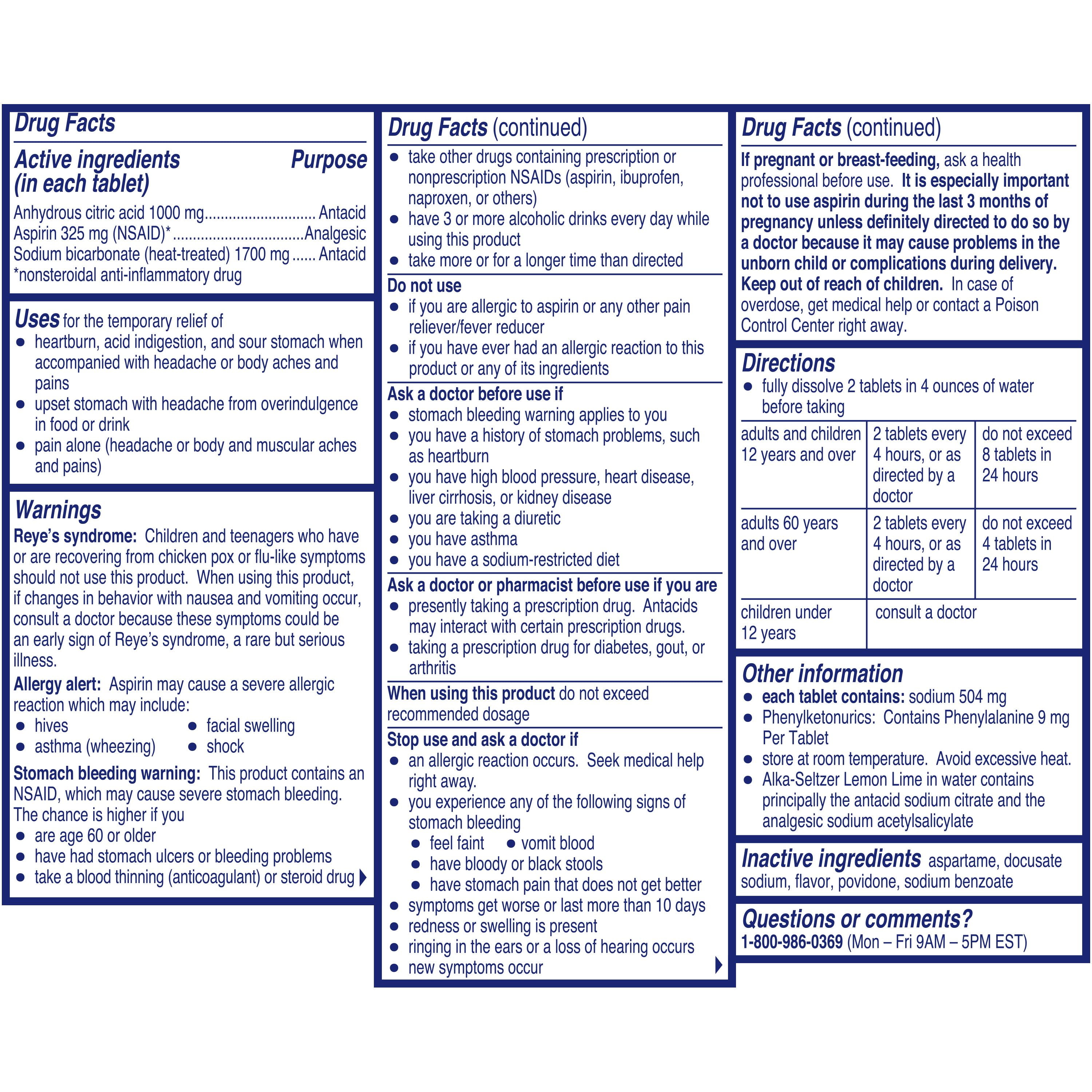 The name you trust for fast and effective relief.AntacidBayer IncActive Ingredients:Per Tablet: Citric Acid 1000 mg; Sodium Bicarbonate (Heat-Treated) 1940 mgFully dissolve tablets in 4 ounces of water before taking. Adults and children 12 years and over: 2 tablets every 4 hours as needed, or as directed by a doctor. Do not exceed 8 tablets in 24 hours. Adults 60 years and over: 2 tablets every 4 hours as needed, or as directed by a doctor. Do not exceed 4 tablets in 24 hours. Children under 12 years: Consult a doctor.Inactive Ingredients:Acesulfame Potassium; Aspartame; Flavor Enhancer; Flavors; Magnesium Stearate; Mannitol; Each Tablet Contains Sodium 575 mgUses:For the relief of: heartburn, acid indigestion, upset stomach associated with these symptoms. Alka-Seltzer Heartburn Relief extinguishes the fire of your worst heartburn. Its unique aspirin free effervescent formula starts to work the instant you take it.Ask a doctor before use if you have a sodium-restricted diet. Ask a doctor or pharmacist before use if you are presently taking a prescription drug. Antacids may interact with certain prescription drugs. When using this product do not exceed recommended dosage. Stop use and ask a doctor if you have taken the maximum dose for 2 weeks. If pregnant or breast-feeding, ask a health professional before use. Keep out of reach of children. Phenylketonurics: Contains phenylalanine 5.6 mg per tablet.Take any time – morning, noon or night – when you need relief.